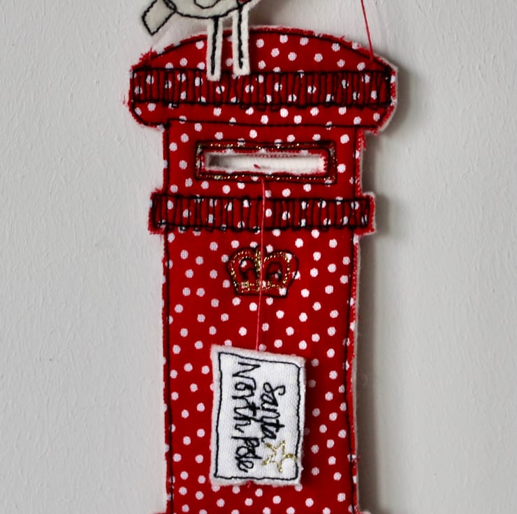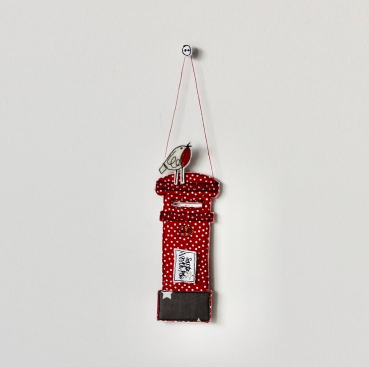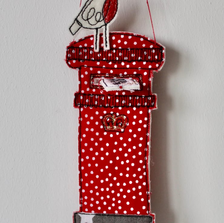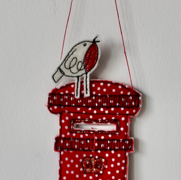 Little dotty posting box is created using 100% wool felt, cotton cloth, metallic thread, linen thread and free hand machine embroidery. There is a cut out slot for the little letter to be posted through and a linen thread to hang.