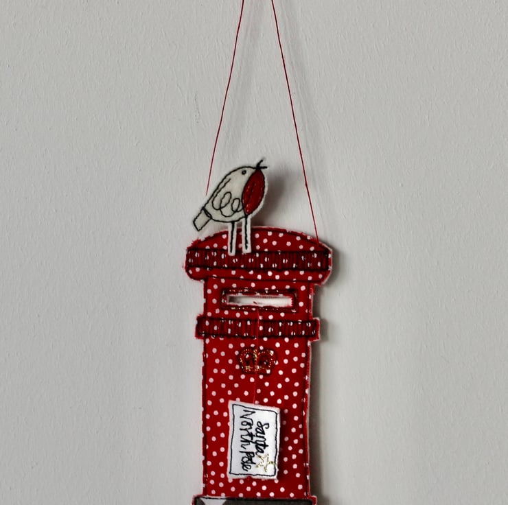 Robin is sitting on a little dotty posting box, waiting for the letters to Santa to be posted.