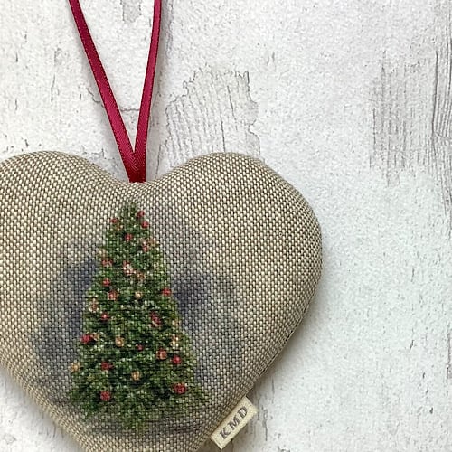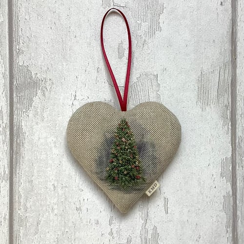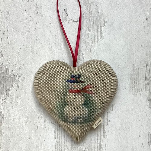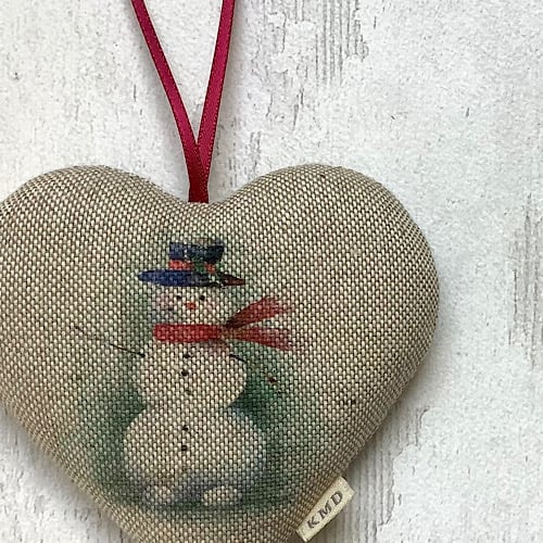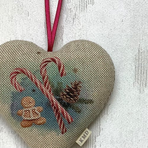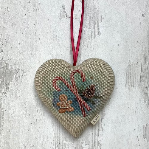 Decorative Christmas hearts in three different designs on natural style fabric. Snowman, Candy Canes and Christmas Tree options. 9cm wide by 16cm high to top of ribbon. These items are a perfect decoration for the home or as a mini gift. It is sold as 1 piece. Matching bunting available in these fabrics.