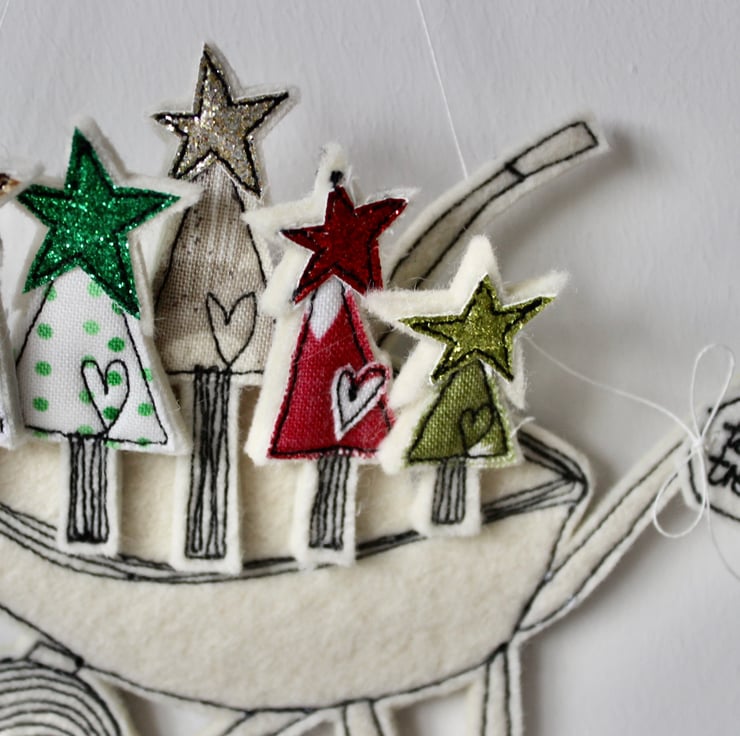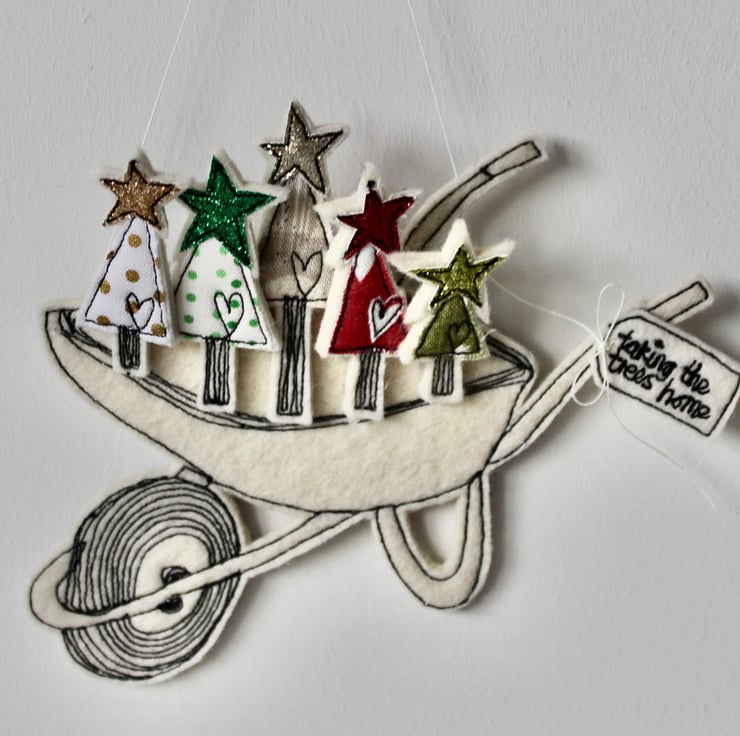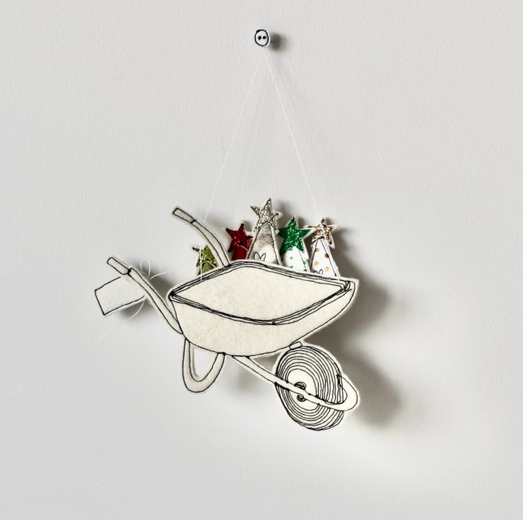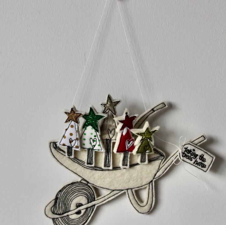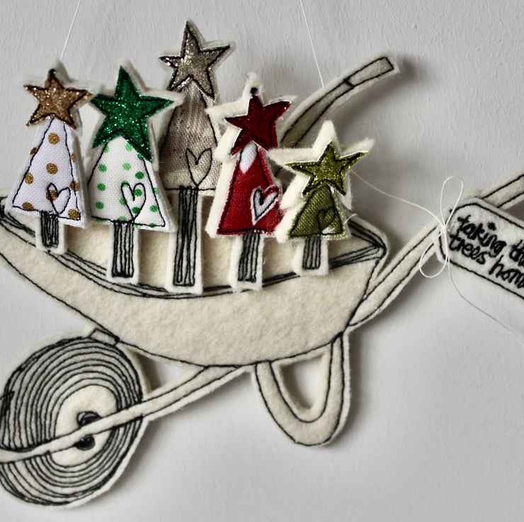 'Taking the tree home' wheelbarrow is sewn using 100% wool felt, cotton cloth, glitter fabric and free hand machine embroidery; multiple layers of cloth are sewn together and cut out by hand using very sharp scissors. With a linen string to suspend.
