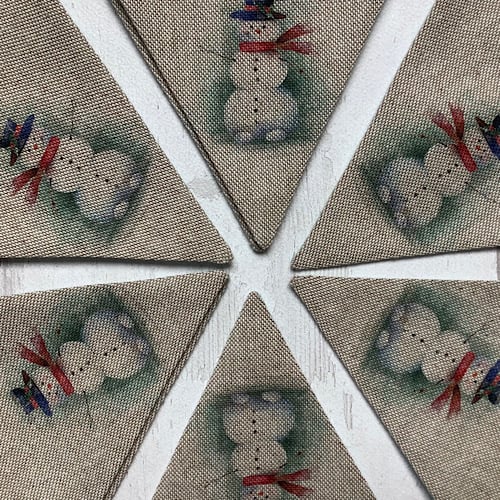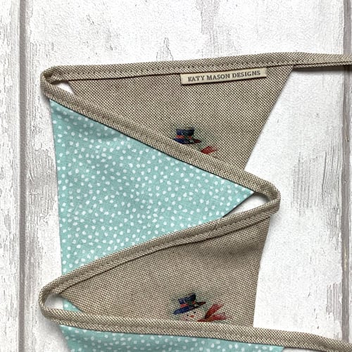 Christmas snowman bunting on natural fabric. 9 flags measuring 12.5cm by 12.5cm and backed in blue spot cotton. 189cm from loop to loop, 135cm from flag to flag. 100% cotton/linen mix. If you have purchased my bunting before then this is slightly longer with two extra flags because the flags are slightly smaller.