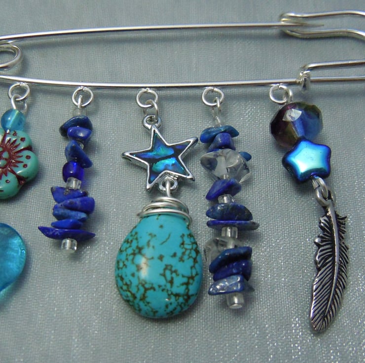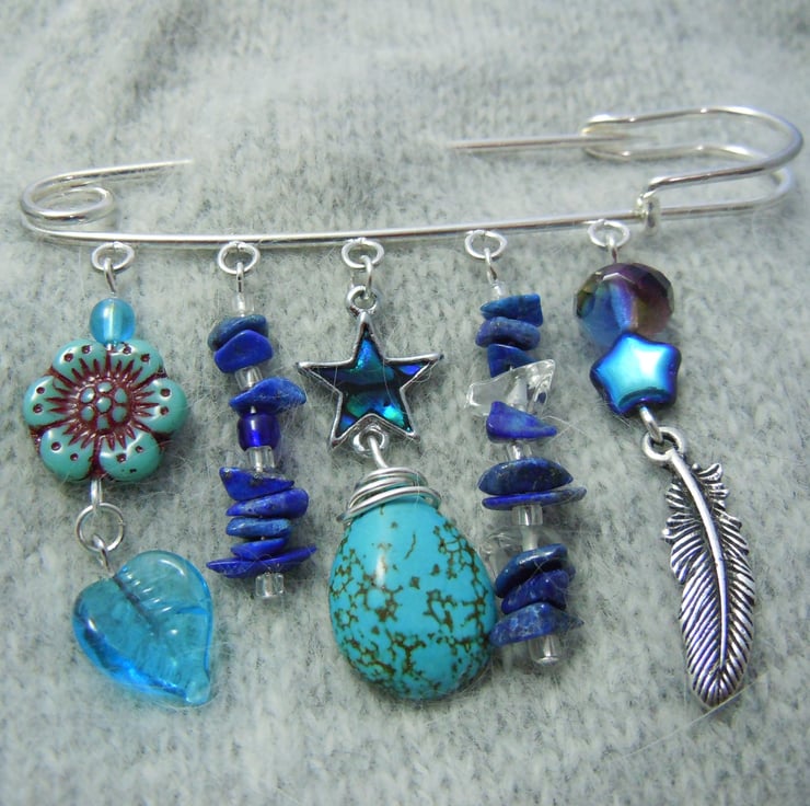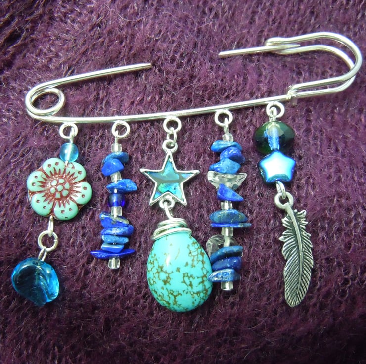 A silver plate kilt pin brooch with a semi precious teardrop Magnesite dyed turquoise bead, Lapis Lazuli chip beads, a Czech glass turquoise anemone bead, a faceted glass bead & metallic blue star bead. Also a silver tone star bead with mother of pearl, acrylic blue leaf charm & a TierraCast feather charm. Beautiful blues would enhance any outfit. Lapis Lazuli is a birthstone for September.