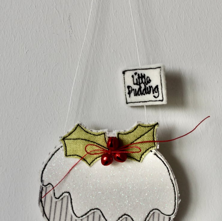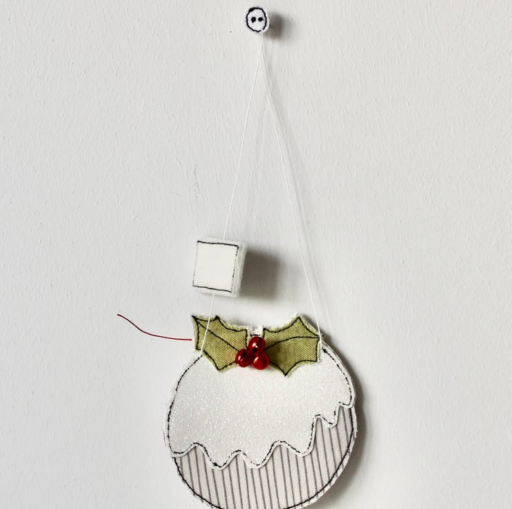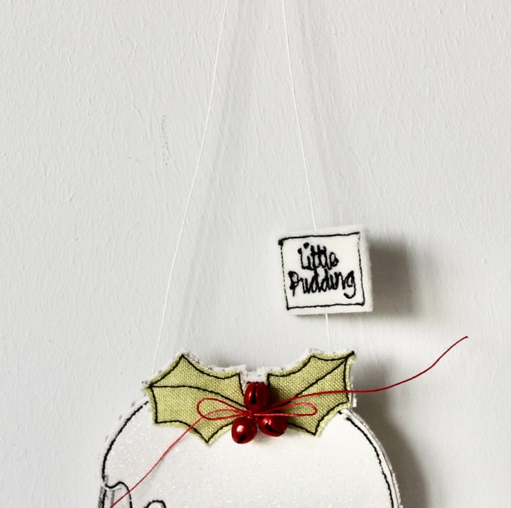 Each little pudding decoration is created using multiple layers of cloth, sewn using freehand machine embroidery and then cut out by hand. Finished with six red metal bells and a linen thread to hang.