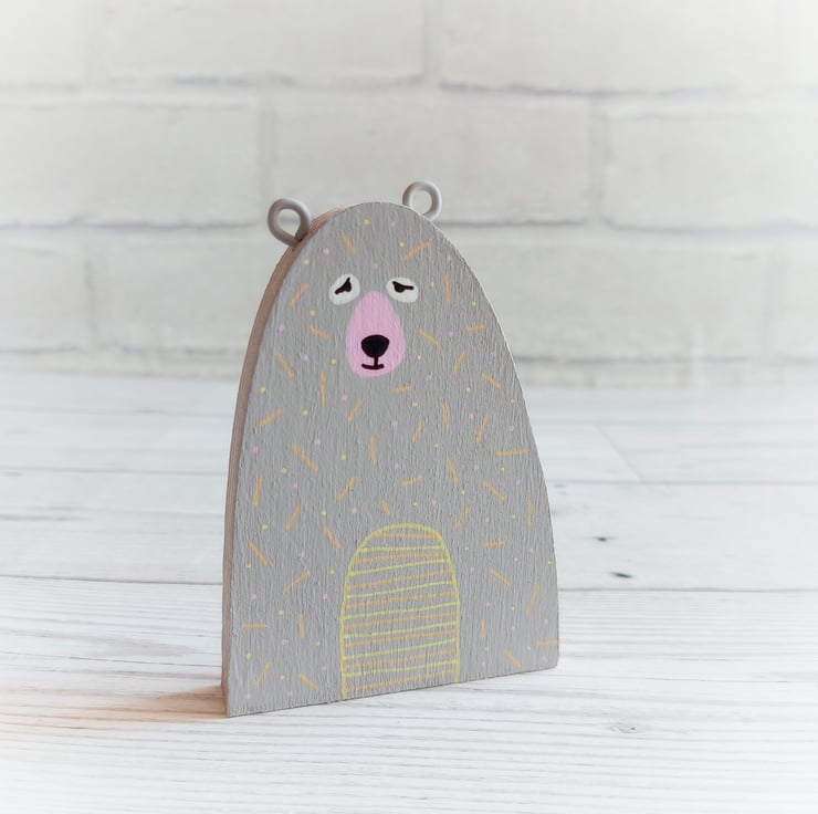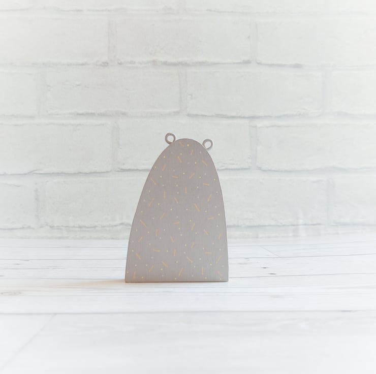 This little wooden bear has been cut from 9mm plywood, painted grey and decorated with orange and yellow 'sprinkles' on both sides.