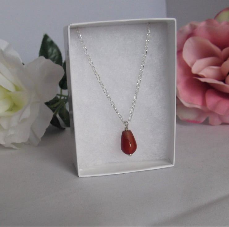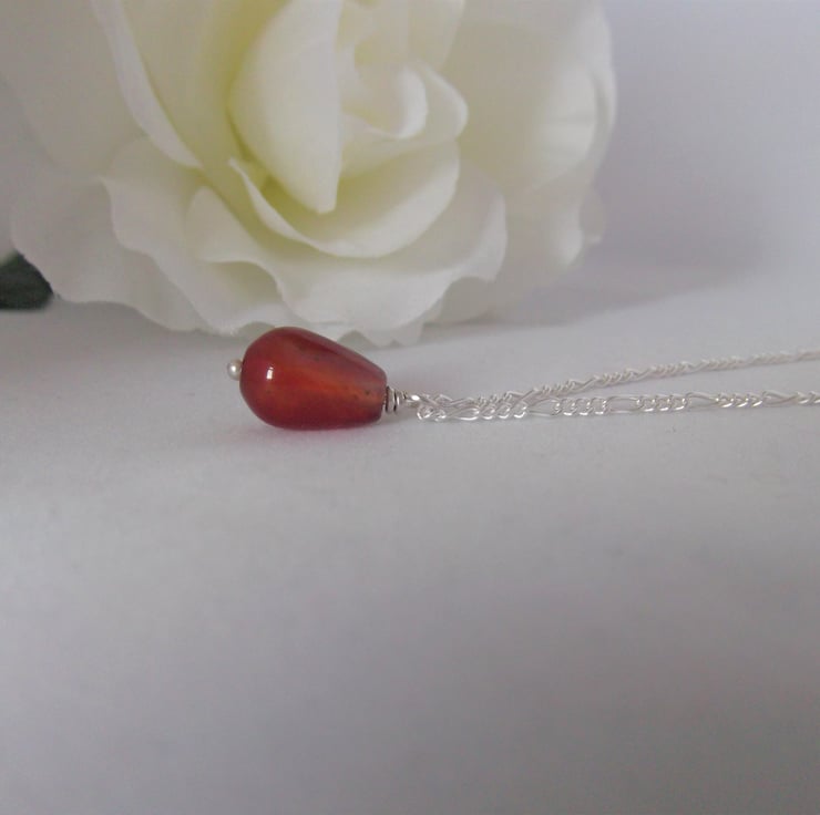 This necklace has been made using a carnelian drop bead and sterling silver wire and chain.