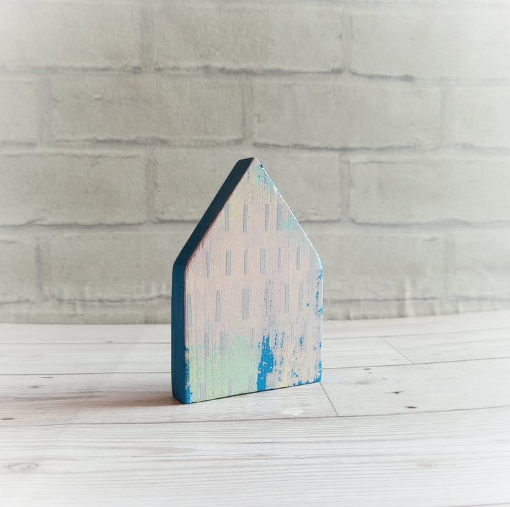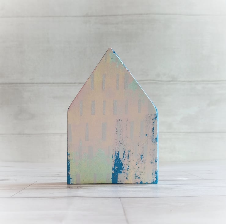 This one of a kind little wooden house is made from reclaimed wood, painted and screen-printed by hand in layers of pale pink, teal, sage green, grey and duck egg blue. The back of the house is blank, and has a slightly rustic/distressed finish.