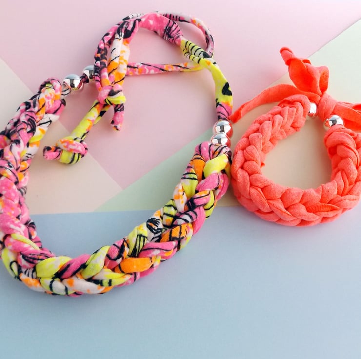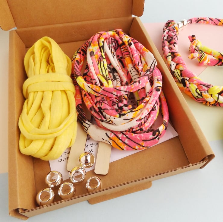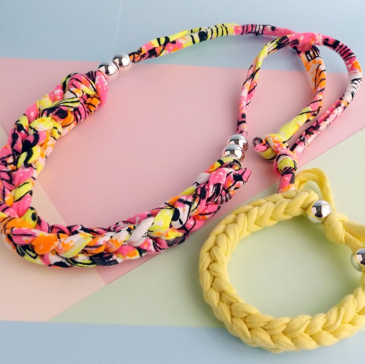 Using the tool provided and high quality recycled t-shirt yarn, you will knit a colourful necklace and coordinated bracelet in a choice of yellow, black or neon pink tones. The necklace yarn is white with a pattern of neon pink, yellow, orange and black.
