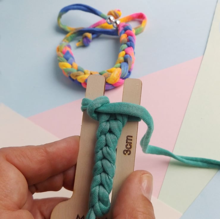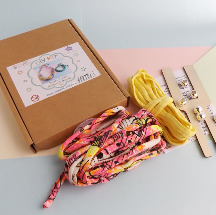 his "Musical Dream " kit comes with everything you need to create a fashionable chunky braided bracelet & necklace set easily using a wooden kitting fork tool.