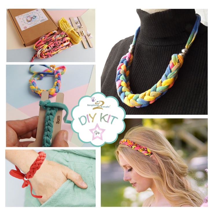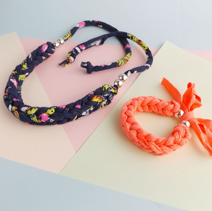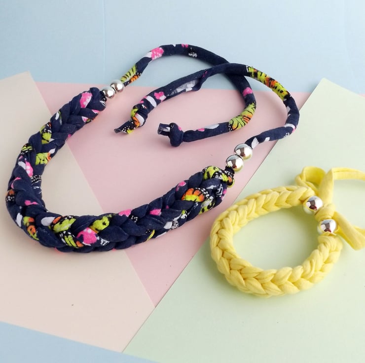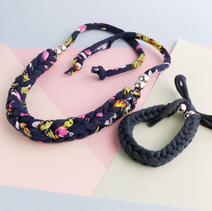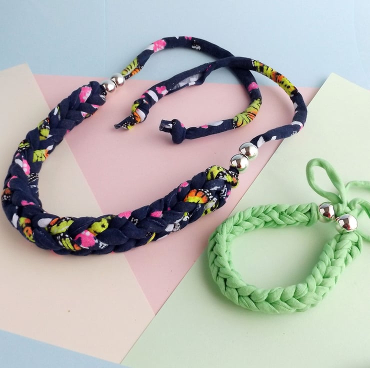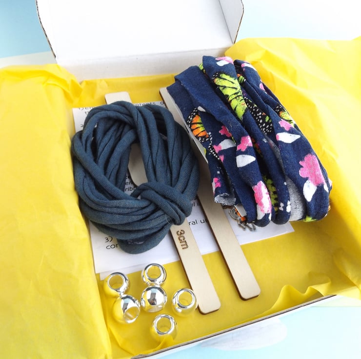 Using just the tool provided and high quality recycled t-shirt yarn, you will knit a beautiful statement necklace and colour coordinated bracelet in a choice of dark blue or apple green colour.