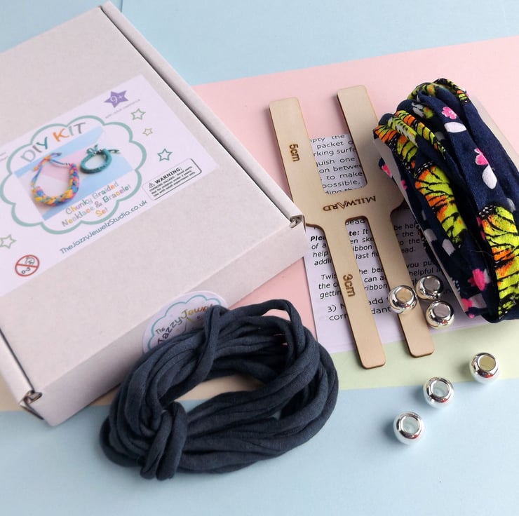 A beginner DIY knitting kit with premium materials for making a corded necklace and bracelet set with accent beads.