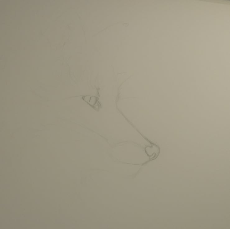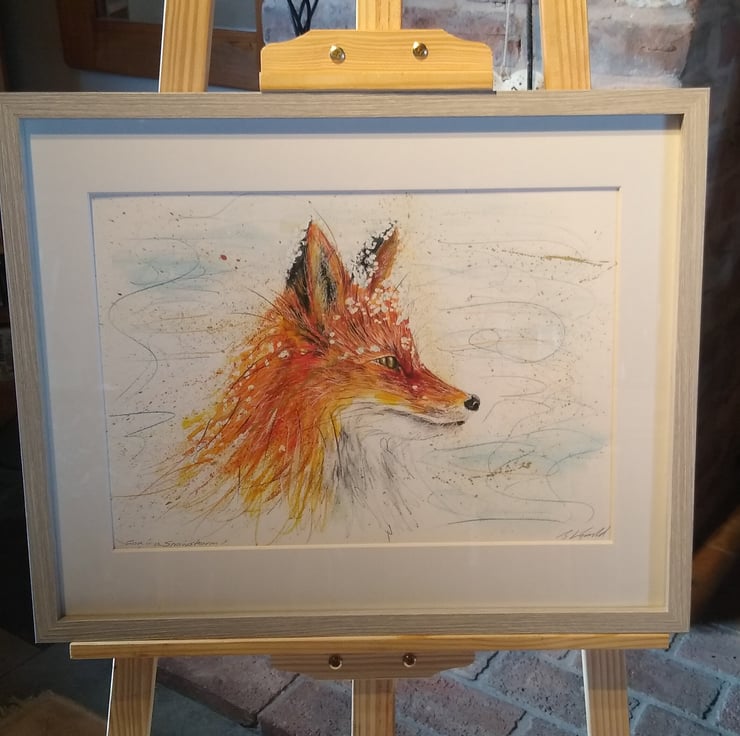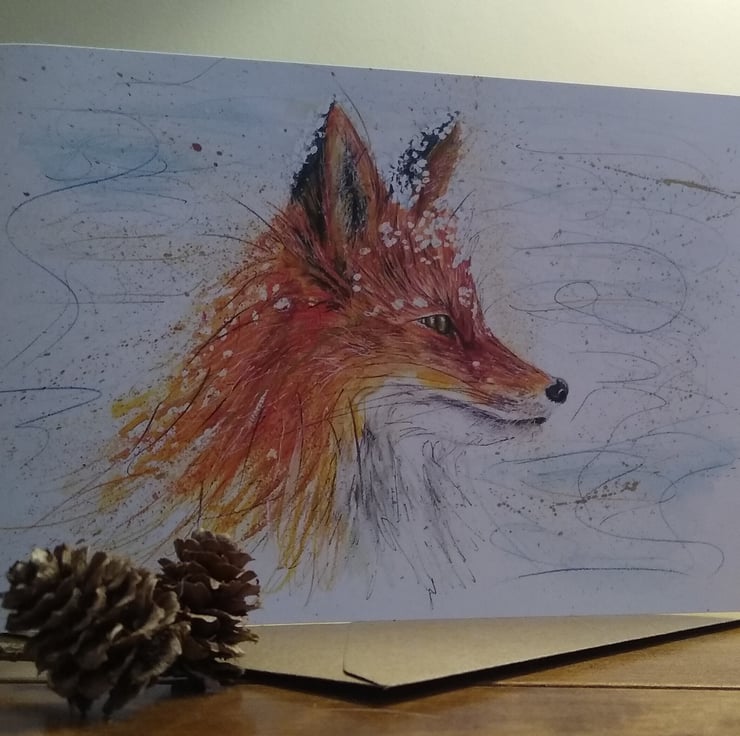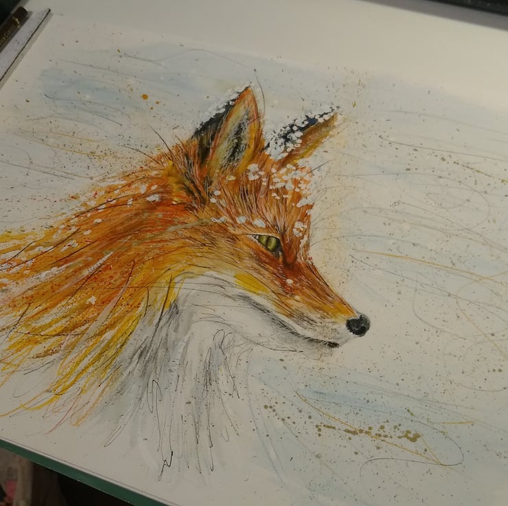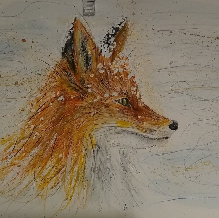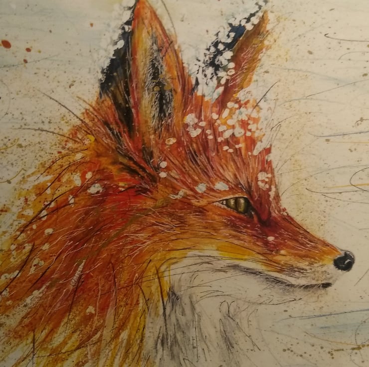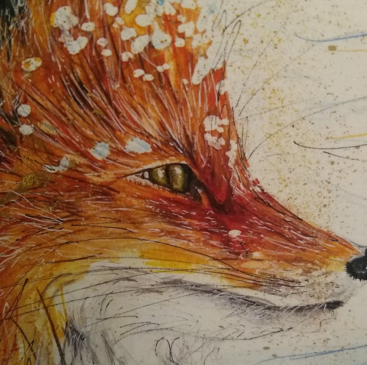 This painting was planned as a Christmas / Winter festival card design. I thought very carefully about the colours, particularly the contrast between the warm oranges and reds of the fox and the cool blues of the background to emulate the snowy scene. I used quickly drawn lines and swirls to give the effect of wind and swirling snow. I also used masking fluid to create paint free flecks of white paper for the snow alighting on the foxes fur.