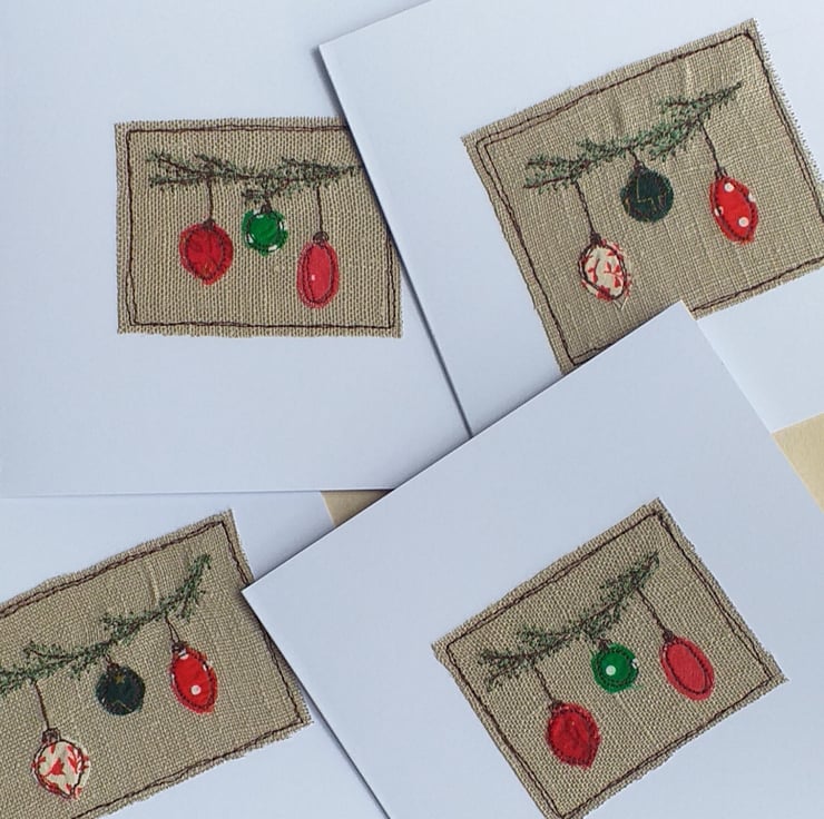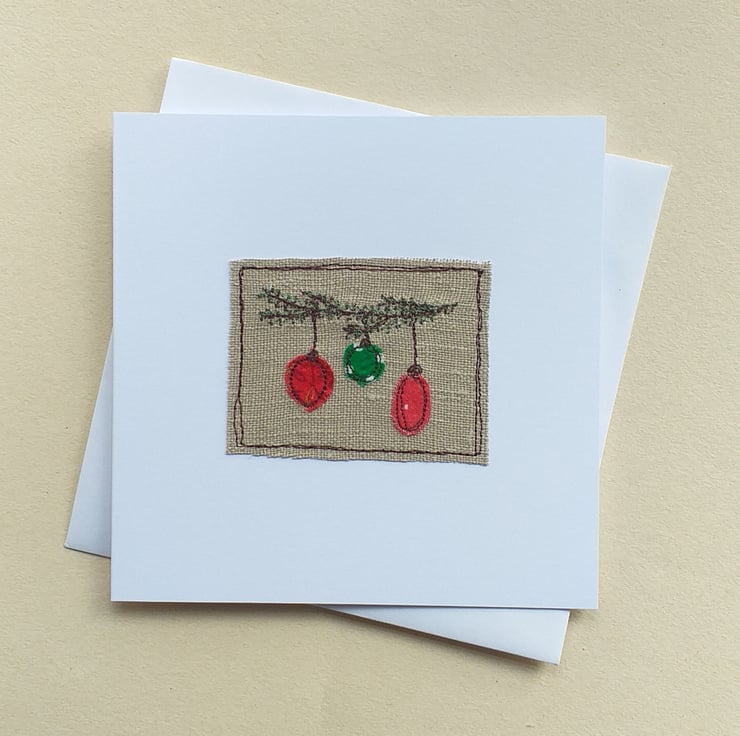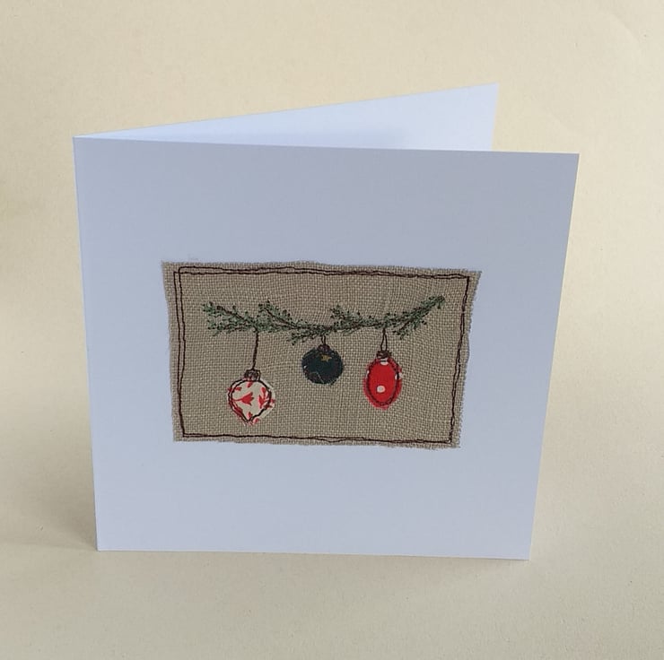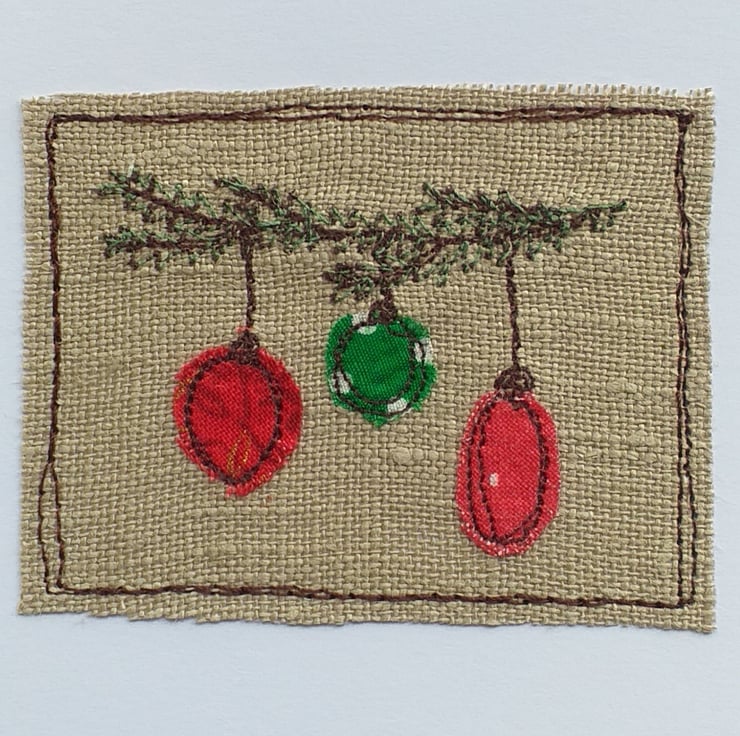 This Christmas card features 3 different baubles hanging on a pine branch. The baubles are appliqued fabric scraps stitched on to linen using free motion embroidery. The branch is embroidered in green thread. The fabric scraps will vary from card to card, but they will all be in greens and reds.