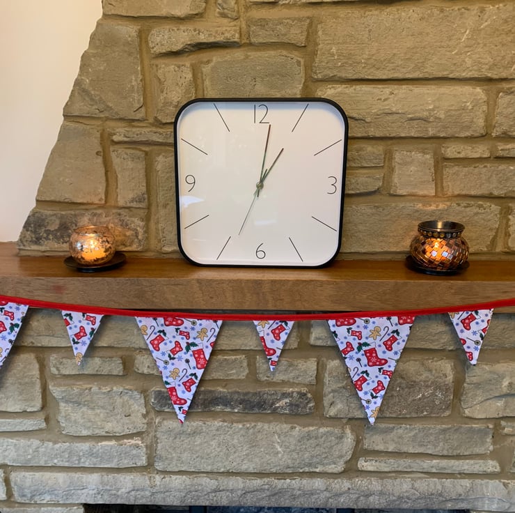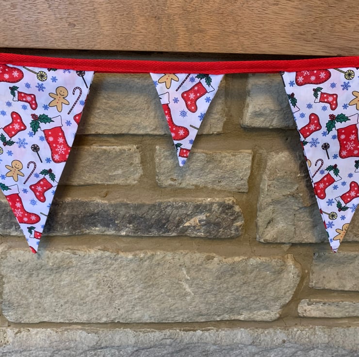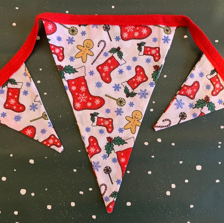 This cute print features gingerbread men, candy canes and stockings. 10 large pennants and 11 small which span 3.46m plus 30cm ties either end.