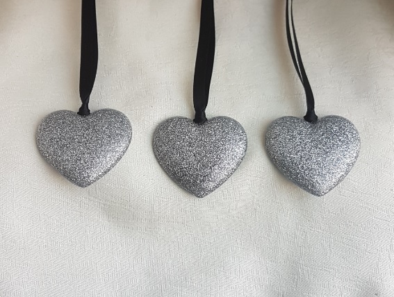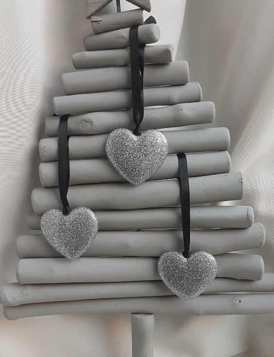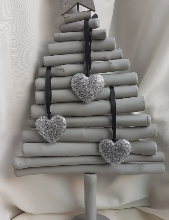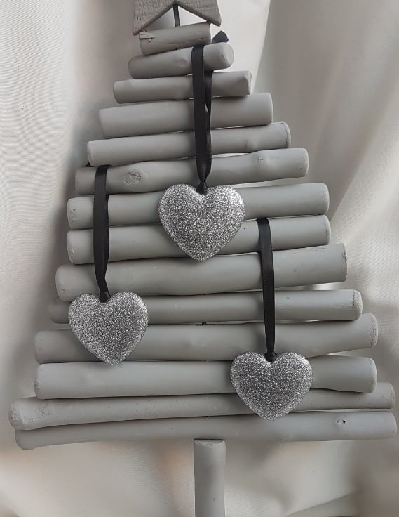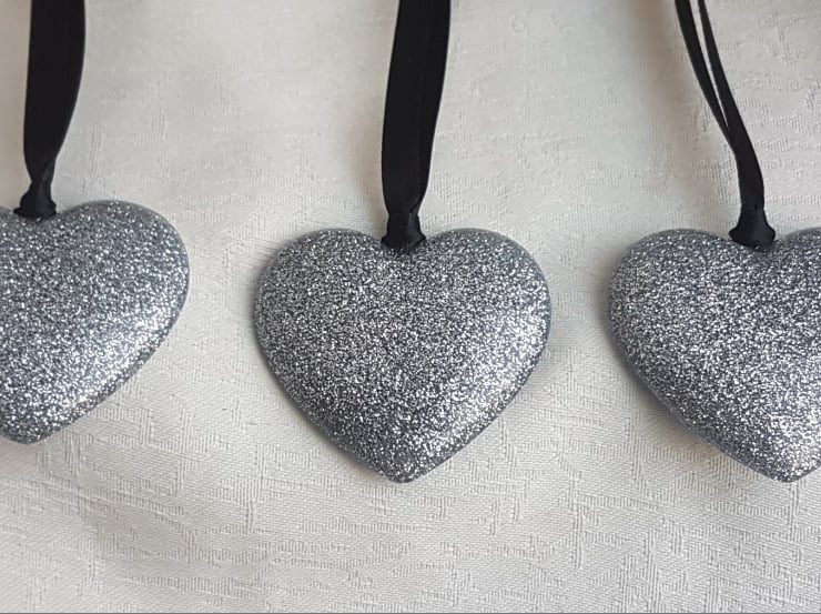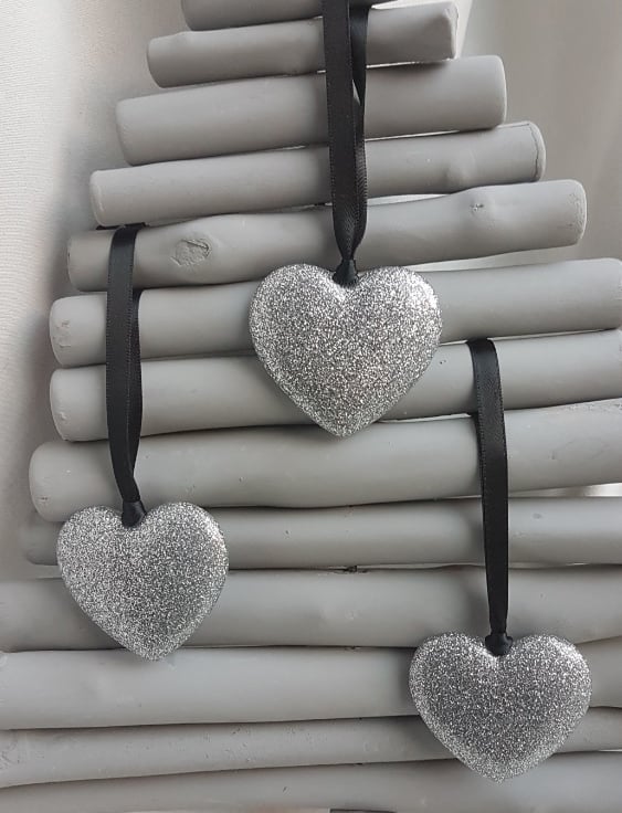 A Gorgeous Glittery set of 3 beautiful flat-back resin heart decorations. Beautifully sparkly and great to hang on your Christmas Tree or as hanging ornaments anywhere you like. These simple, glittery Hearts are a great addition to your festive decor and can be used year after year.