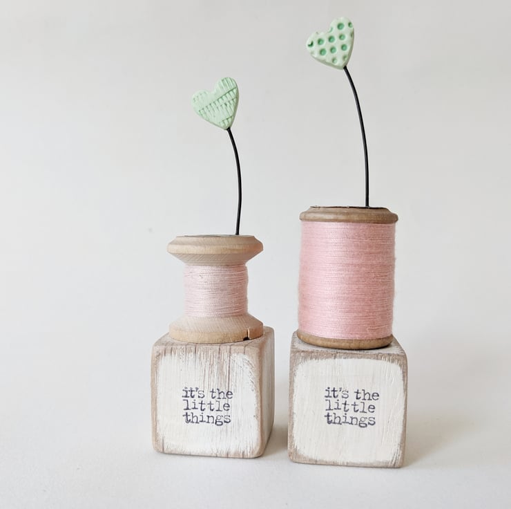 The painted oak block beneath has the hand stamped words 'it's the little things'