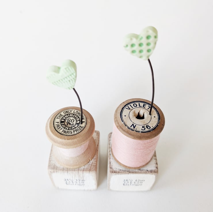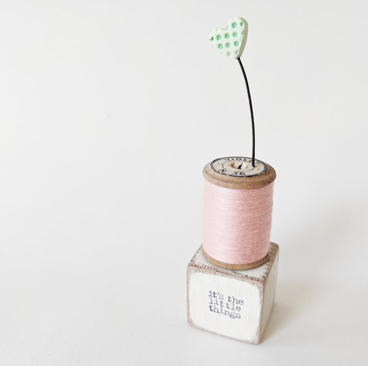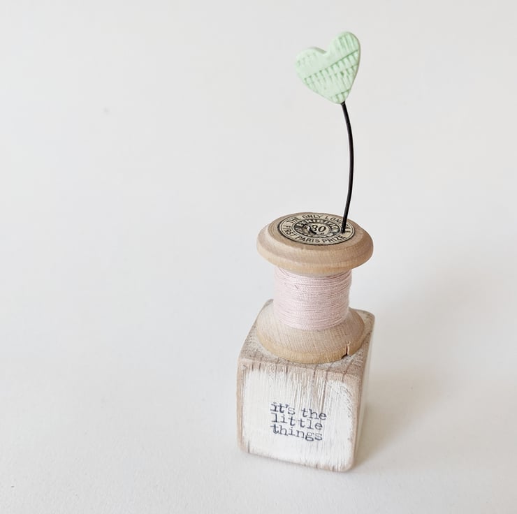 With pretty thread wrapped around and an old label, the mini spool and tiny love heart celebrate the little things in life!