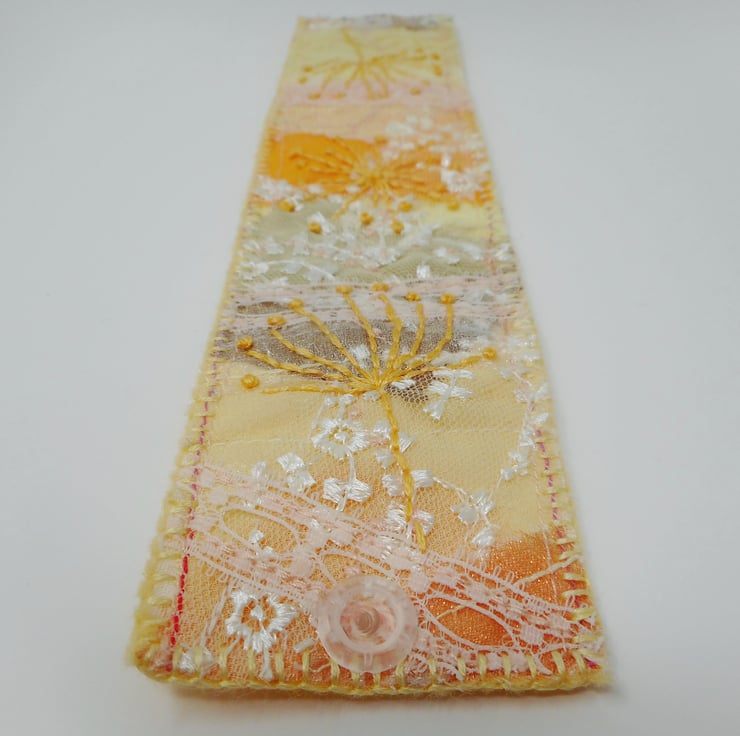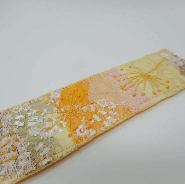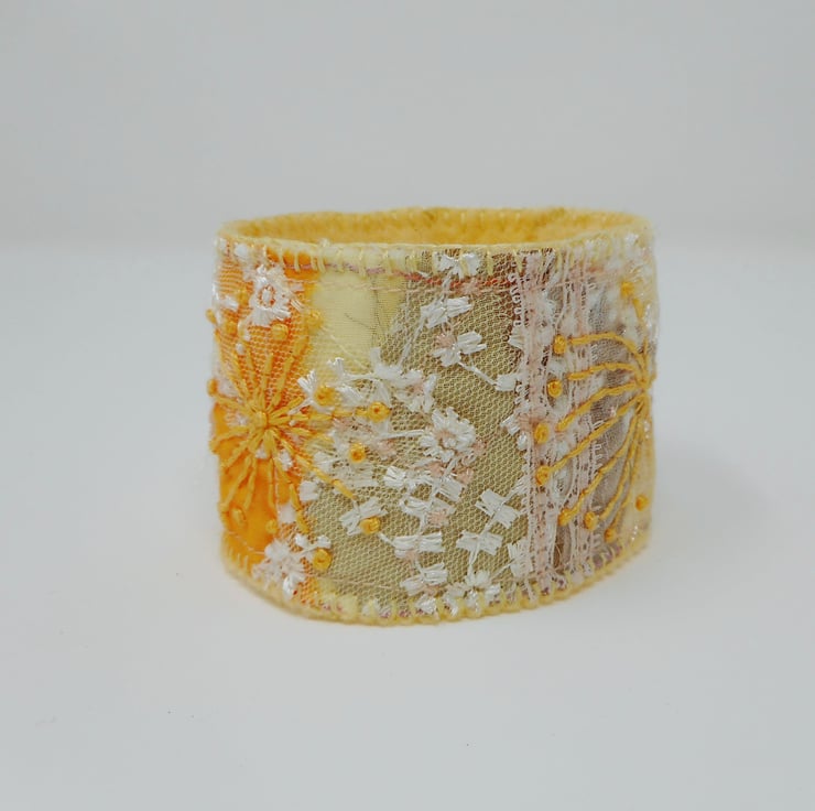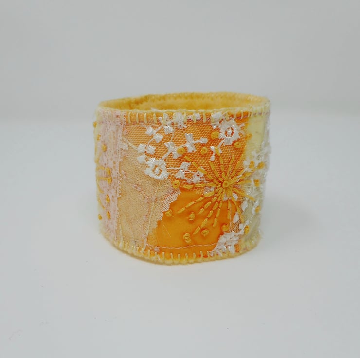Textile jewellery - hand embroidered fabric cuff in lace and silk