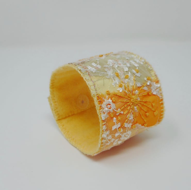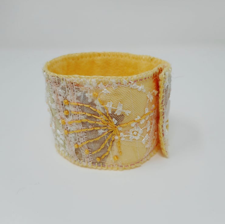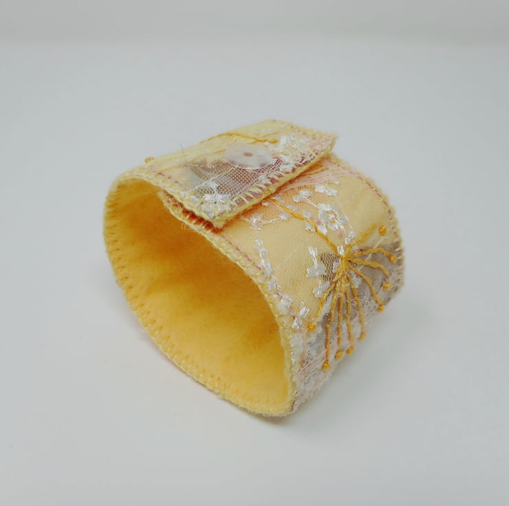 Backed with a delicate yellow wool felt, this cuff fastens with a clear popper stud to an internal circumference of approximately 19cm.
