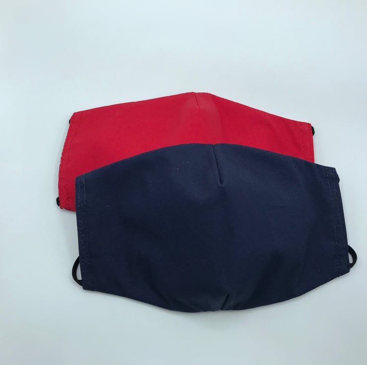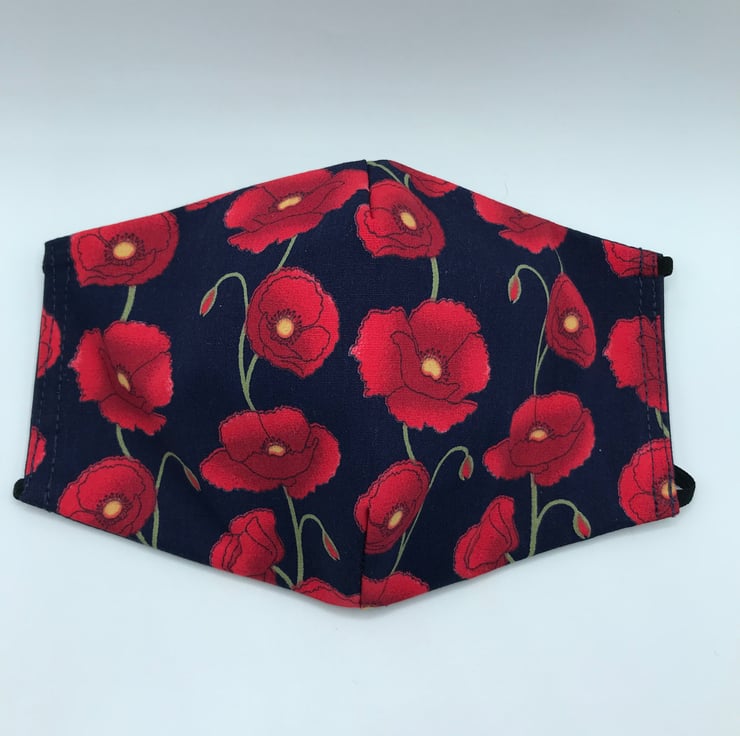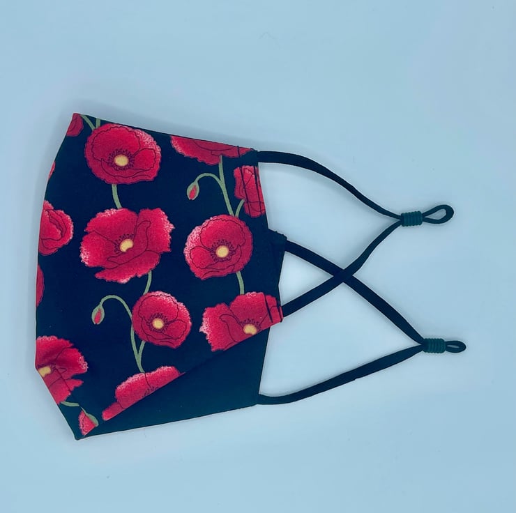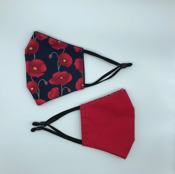 These masks are double-sided with an option for wearing as a patterned poppy mask or a choice of plain navy blue or red.