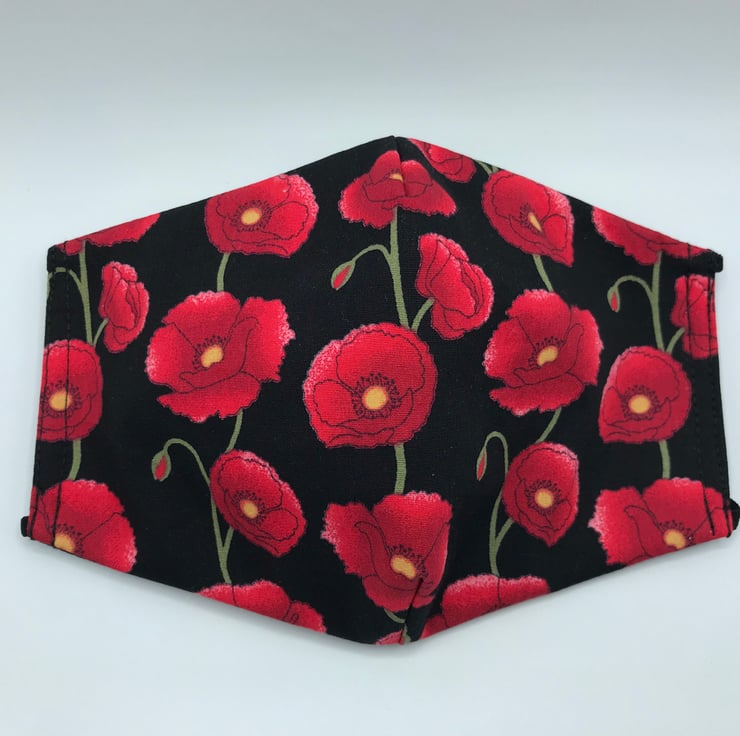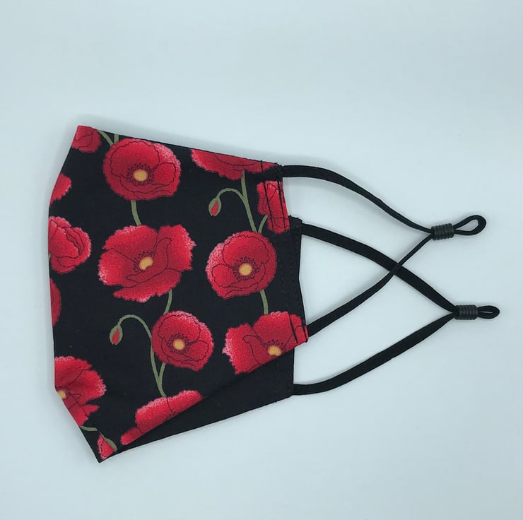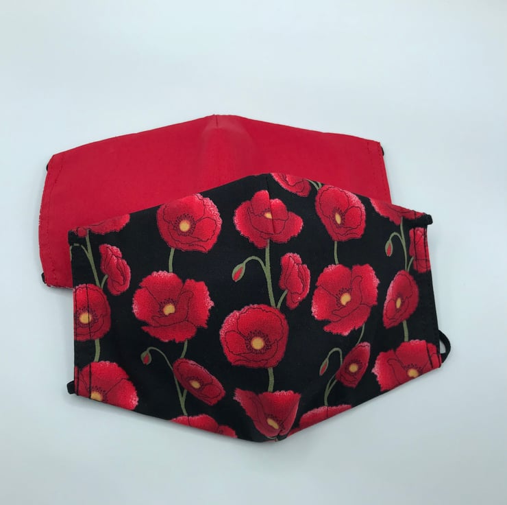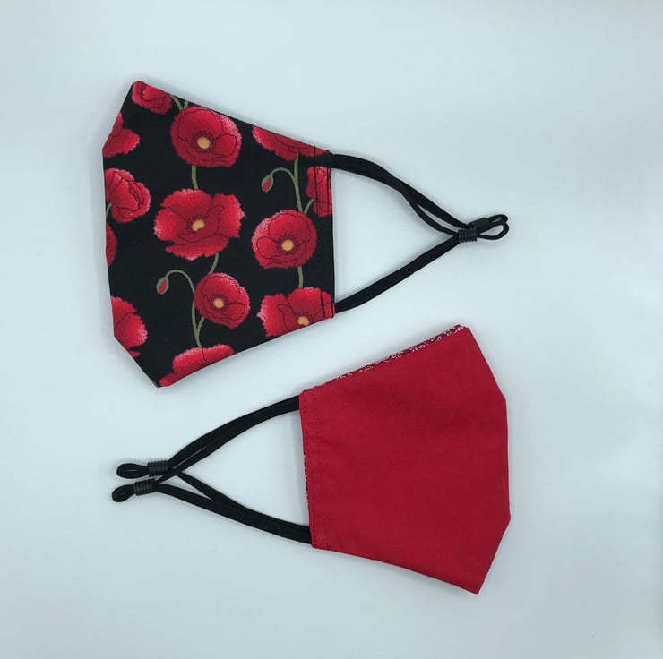 These masks are double-sided with an option for wearing as a patterned poppy mask or a choice of plain black or red.