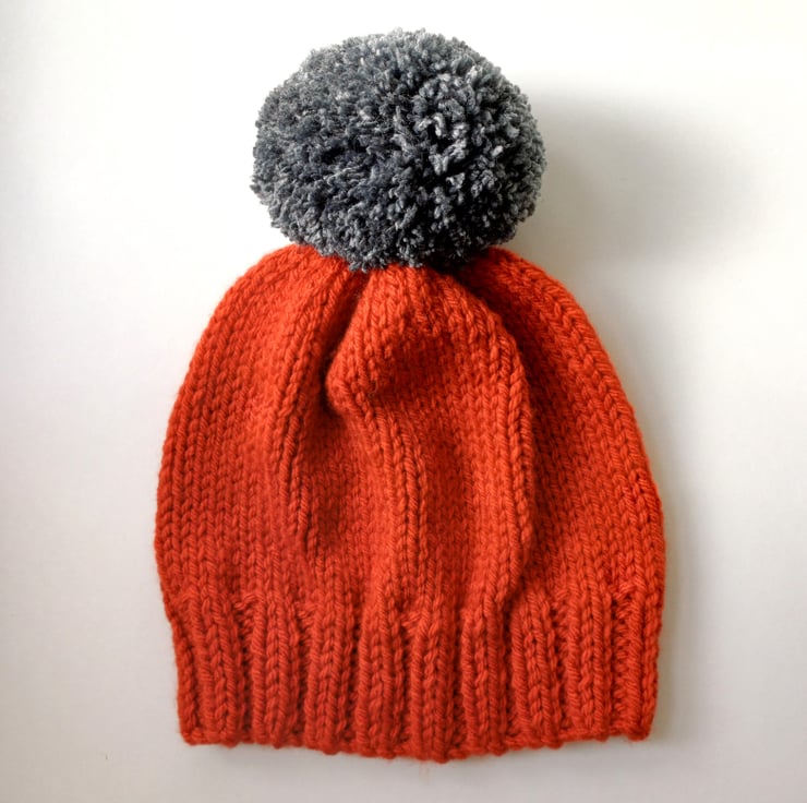 This bobble hat is hand knitted in a burnt orange chunky acrylic yarn with a large mid grey chunky and squishy mid grey pom pom sewn on.
