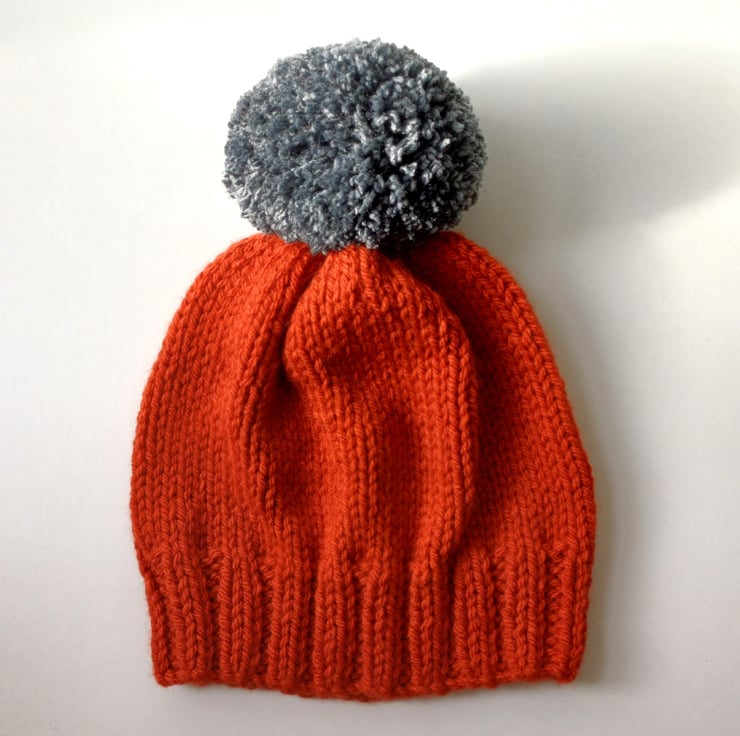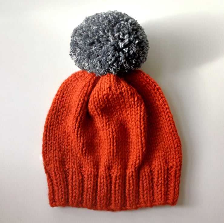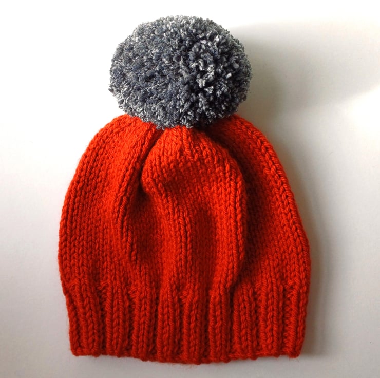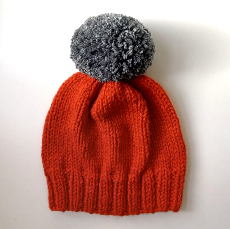 This bobble hat is hand knitted in a burnt orange chunky acrylic yarn with a large mid grey chunky and squishy mid grey pom pom sewn on.