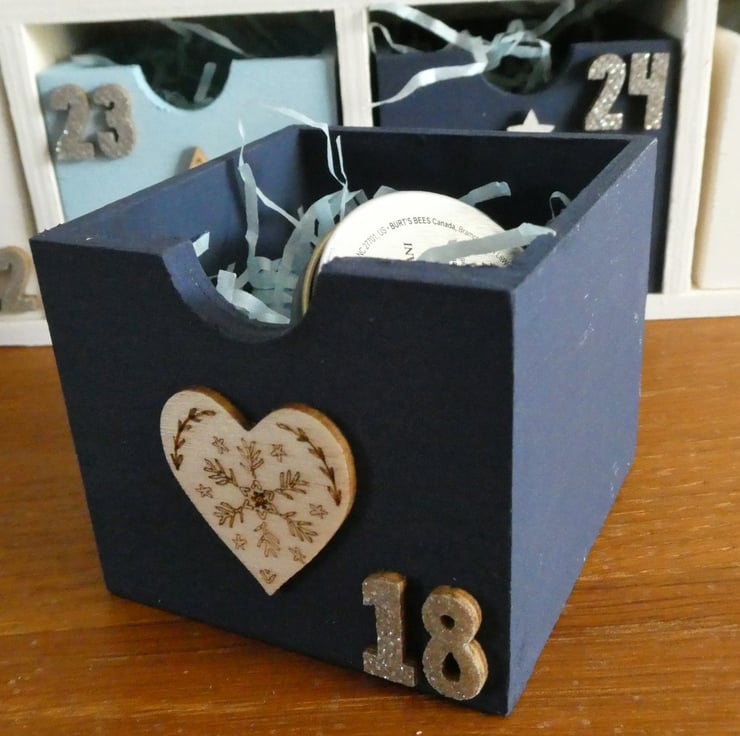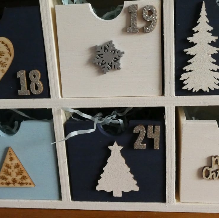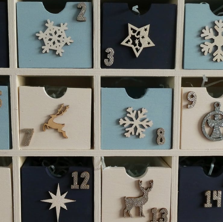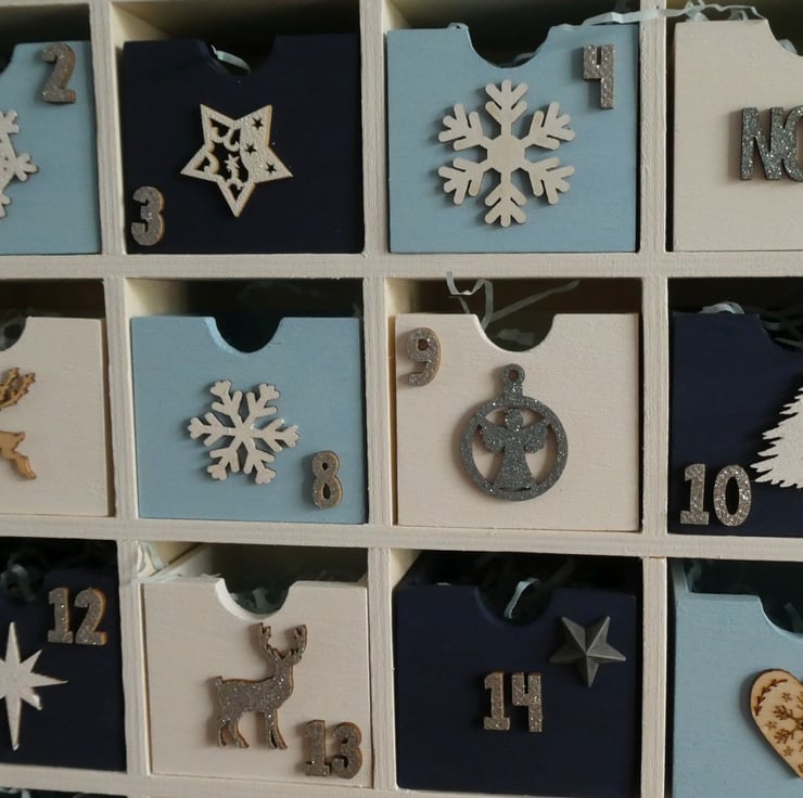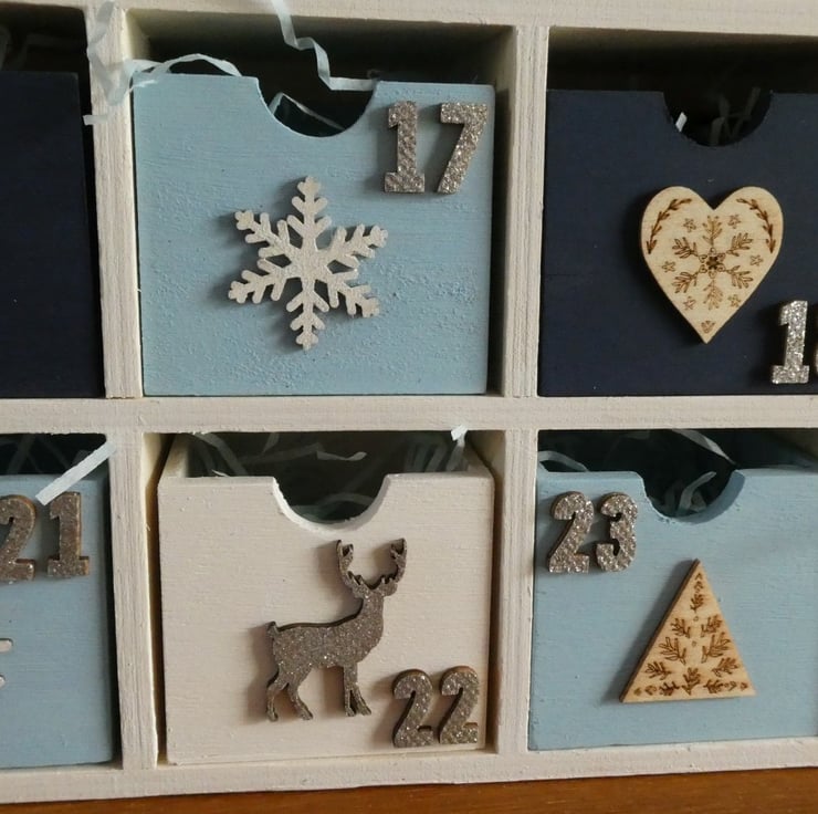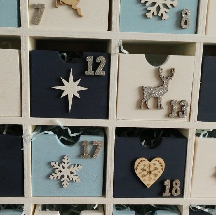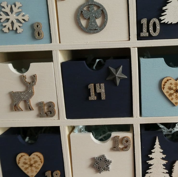 Each drawer is numbered and decorated with a wooden or metal decoration, such as trees, deer or snowflakes with a mixture of painted, glittered and natural wood finishes.