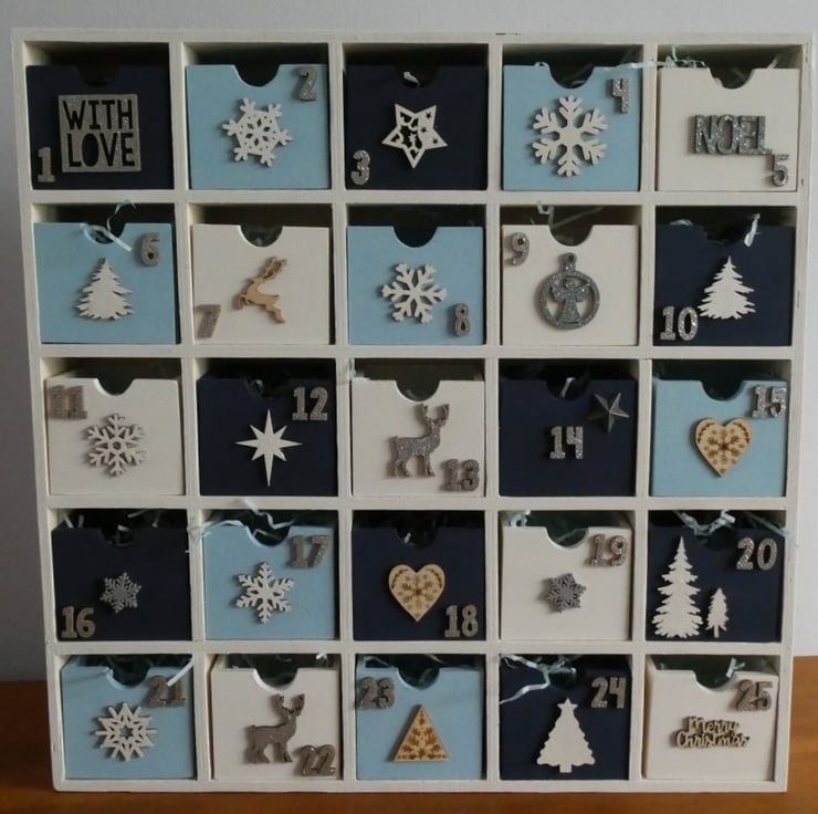 This freestanding wooden advent calendar is hand painted in sophisticated shades of soft white, dark navy & light blue with a softly textured chalky finish.