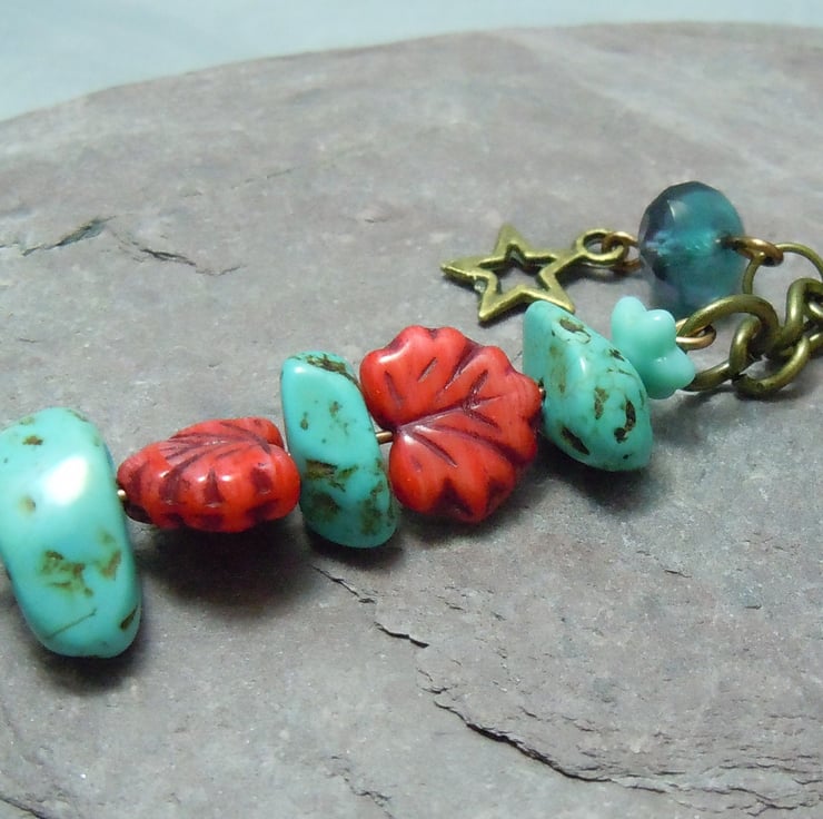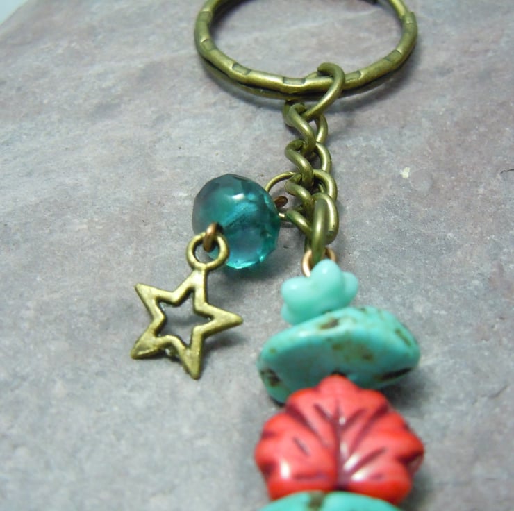 An antique bronze key ring or bag charm decorated with nuggets of Turquoise, Czech glass red maple leaf beads & Czech glass faceted blue crystal bead. Also added in antique bronze are star & feather charms.