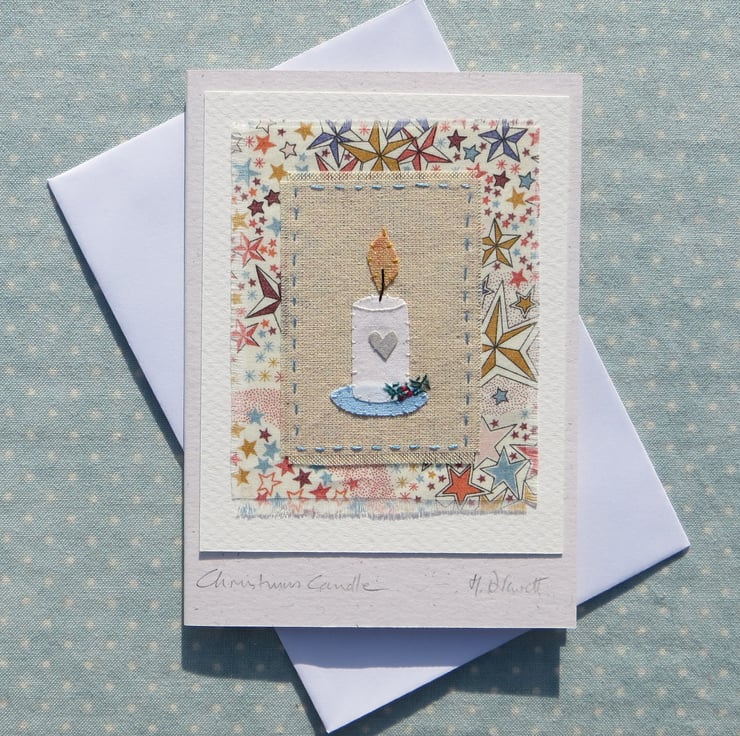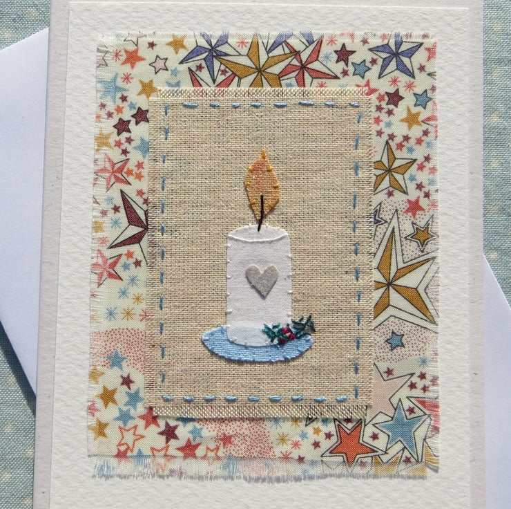 This is a small hand-stitched Christmas card, made using my own hand-dyed recycled cottons and backed with a fine Liberty Tana Lawn fabric. Detailed stitching completes the design. The heart is cut from my silvered handmade paper.