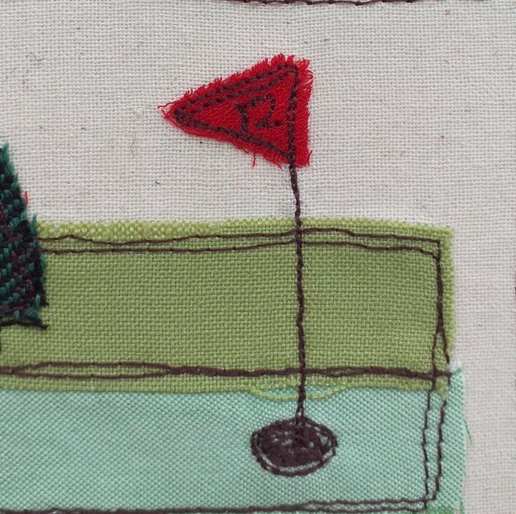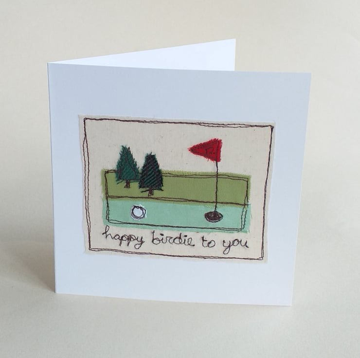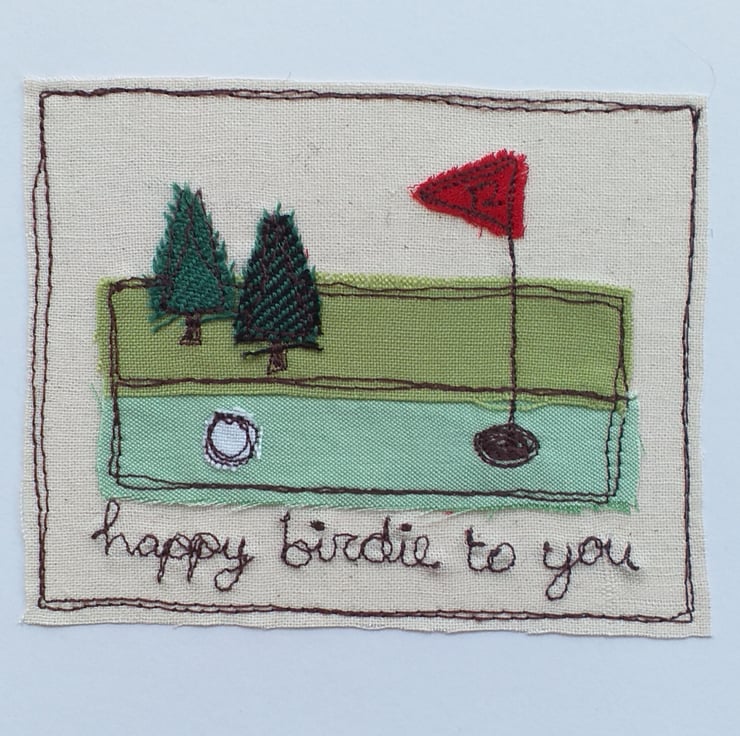 A perfect card for a golf fanatic. A golf course scene with the words "happy birdie to you", all stitched using free motion embroidery. The card can be personalised with a name, and a number on the flag. Please state your choices at checkout.