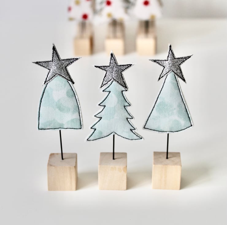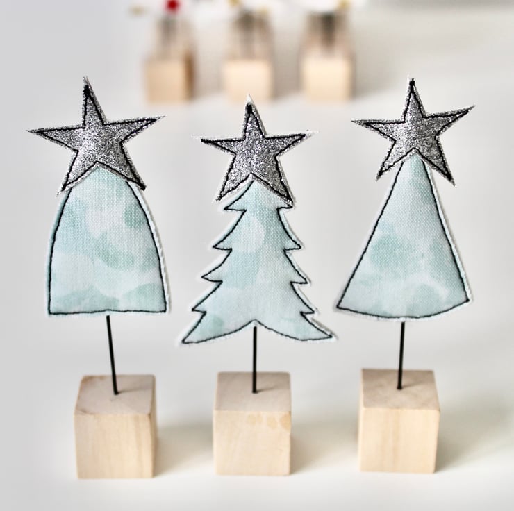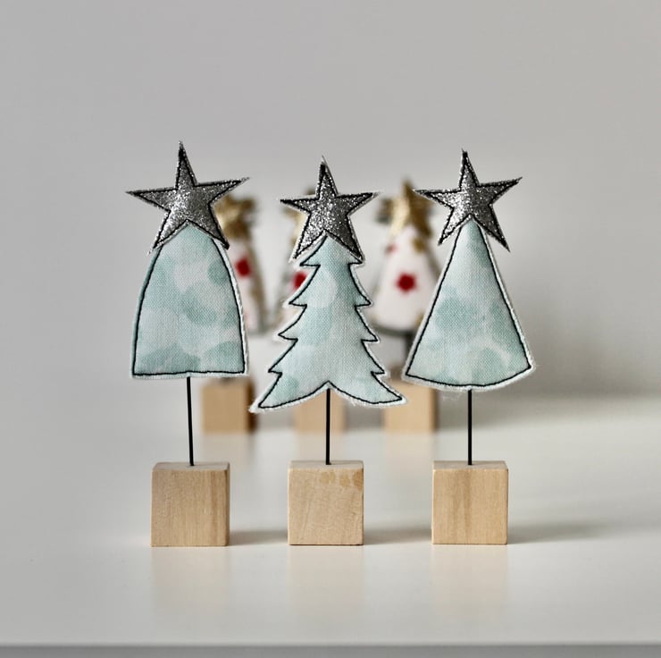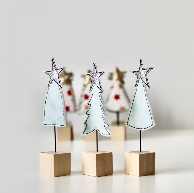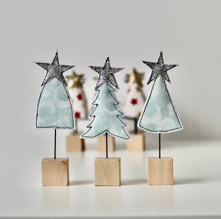 Each of the three handmade Christmas trees, is sewn using 100% wool felt, cotton cloth, glitter fabric and free hand machine embroidery; multiple layers of cloth are sewn together and cut out by hand using very sharp scissors. The trees have wire trunks and stand in a wooden block.