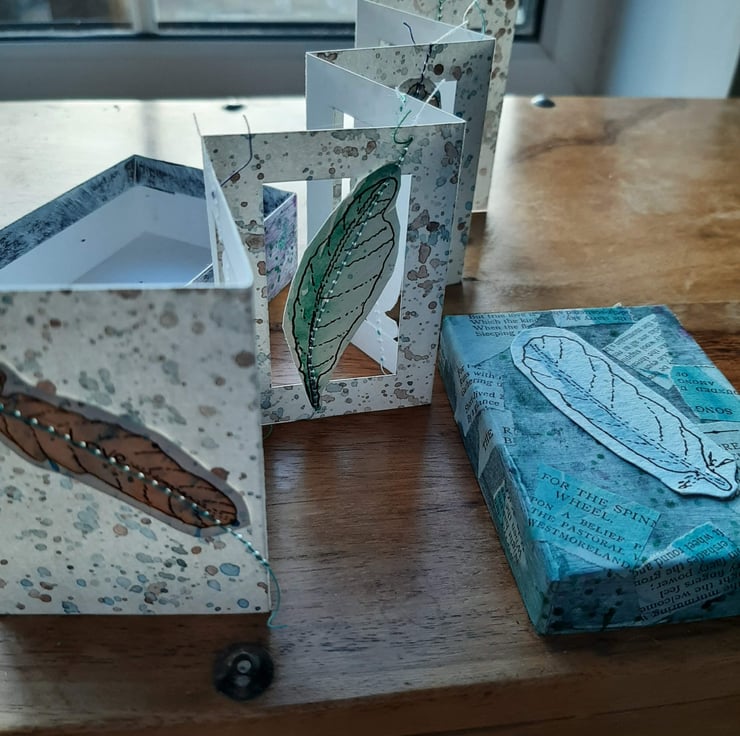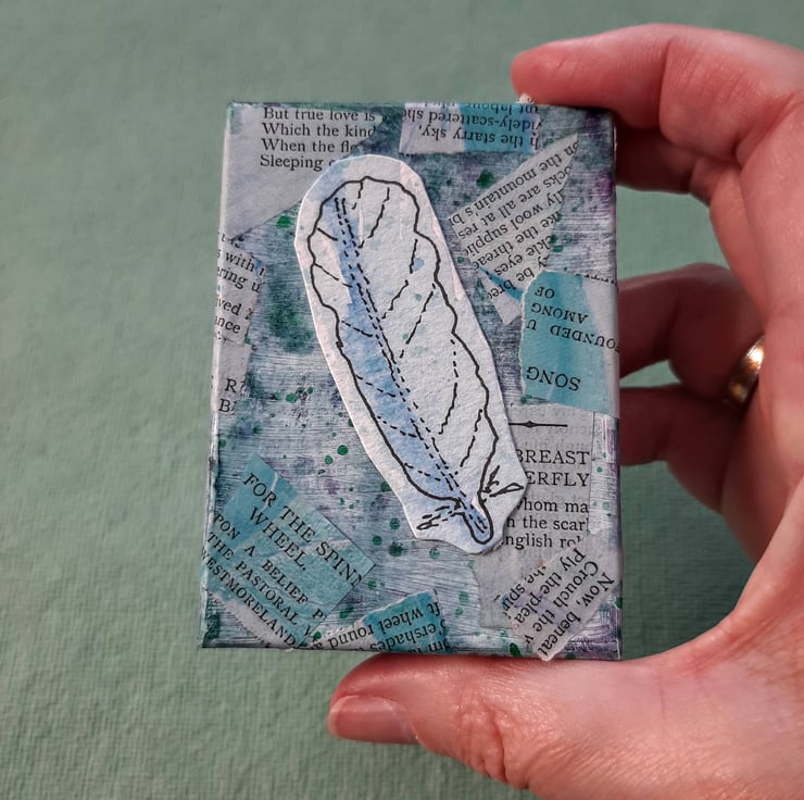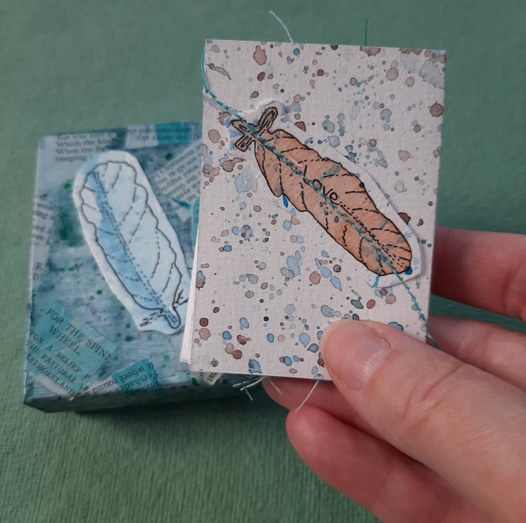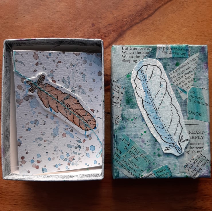 Here's a cute concertina book full of them, one feather per page for 7 pages, residing in it's own painted and collaged box.