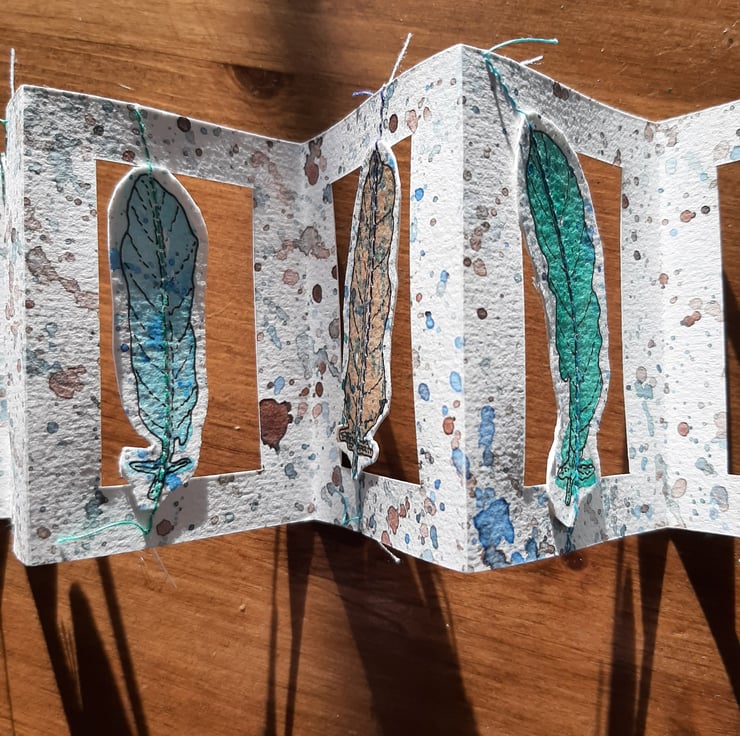 The watercolour was painted first, becoming the book, then each feather was painted and outlined before being cut out individually and sewn in place.