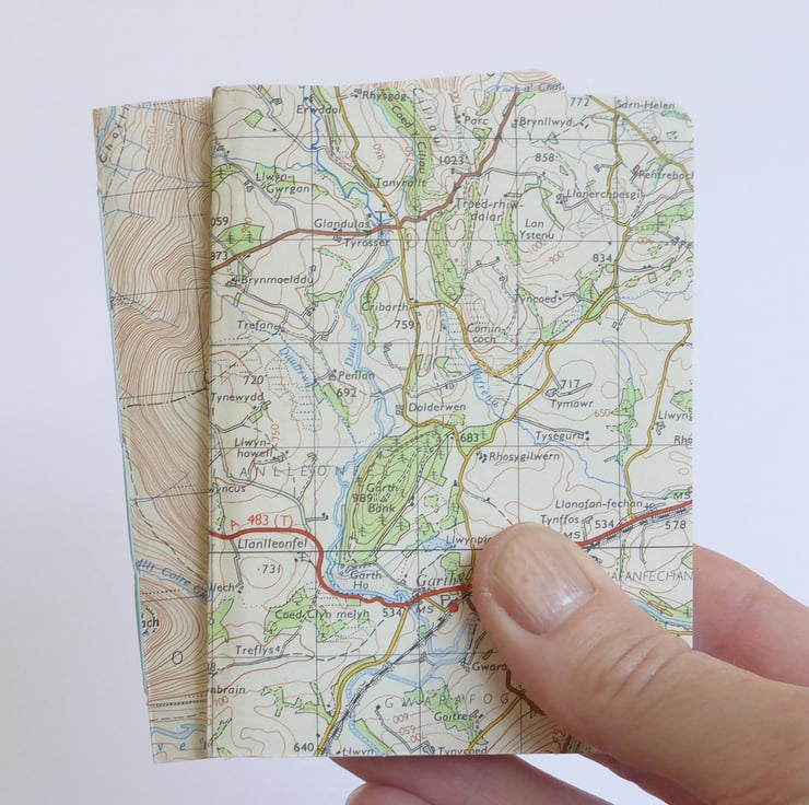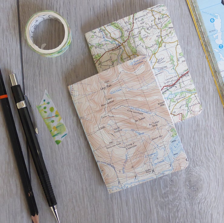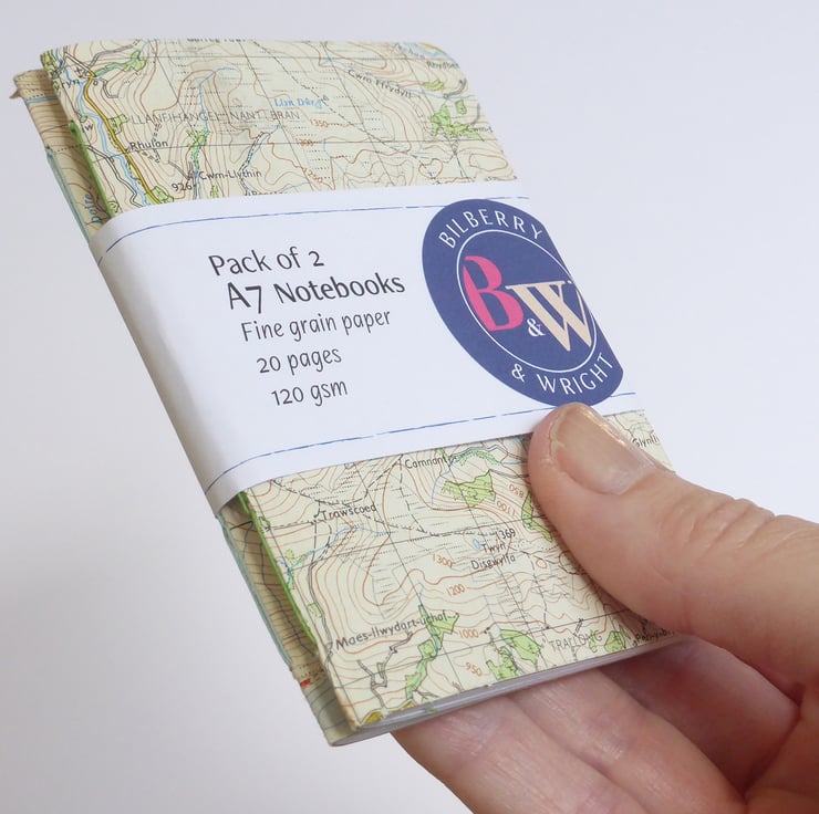 A pack of two handmade A7 notebooks, covered with an ordinance survey map design, made up with fine grain acid-free paper cut to size and stitched together with a traditional handstitched chain stitch linen thread binding one in pale green and other pale blue.