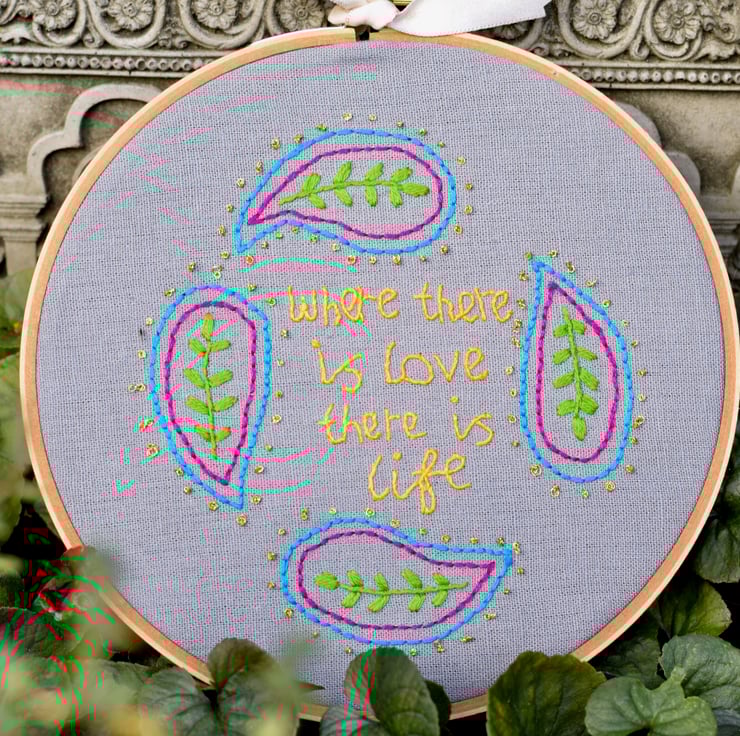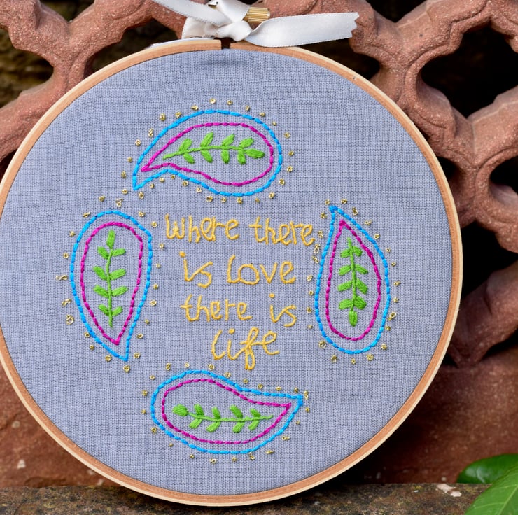 This beautiful quote from Mahatma Gandhi along with Indian, authentic paisley motifs has been hand embroidered onto a grey linen and mounted in a 6" bamboo embroidery hoop. The hoop is backed with cream felt and there is a small piece of ribbon to hang the hoop up with. This little piece of art would make a beautiful gift for someone or just a gift for yourself.