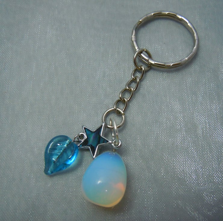 A keyring & bag charm in silver tone metal with a gorgeous Opalite teardrop translucent bead, a silver tone Mother of pearl star charm & an acrylic leaf charm.