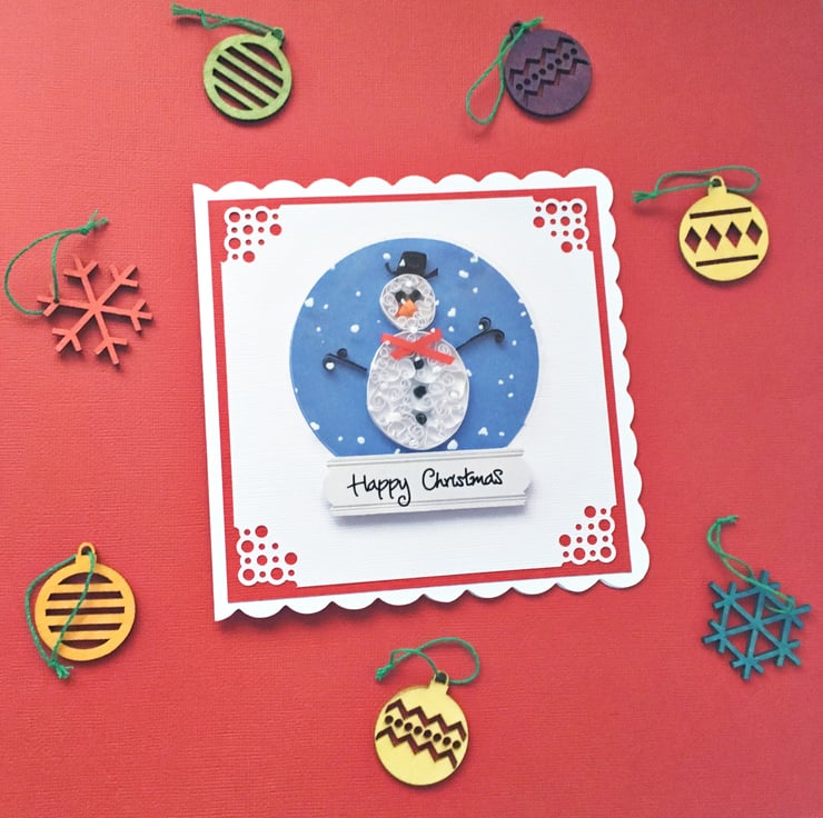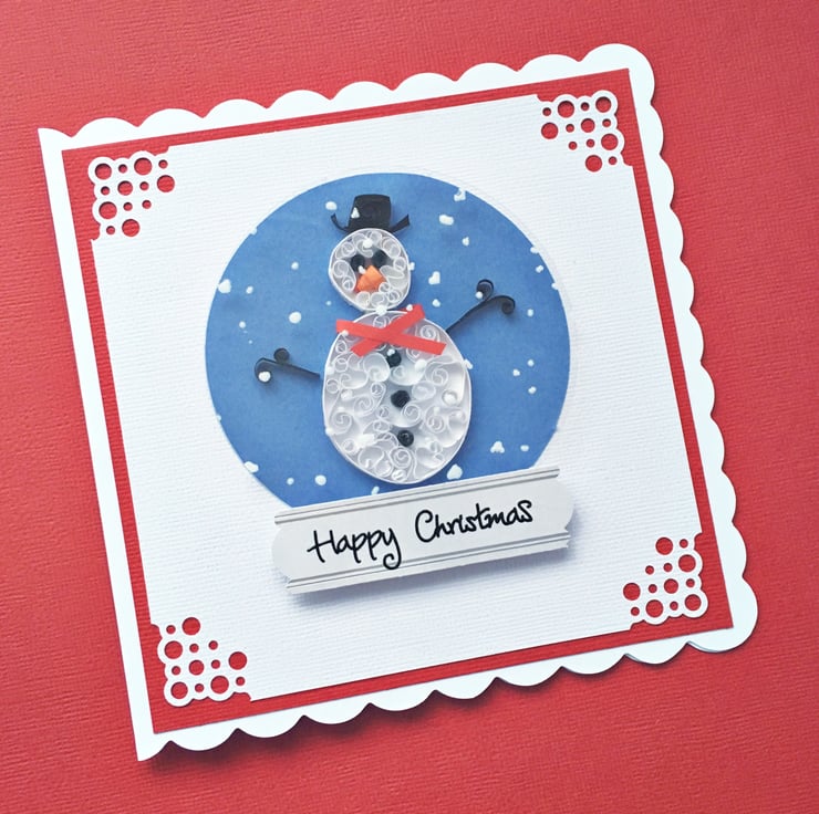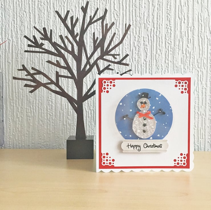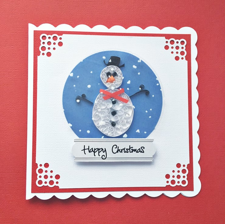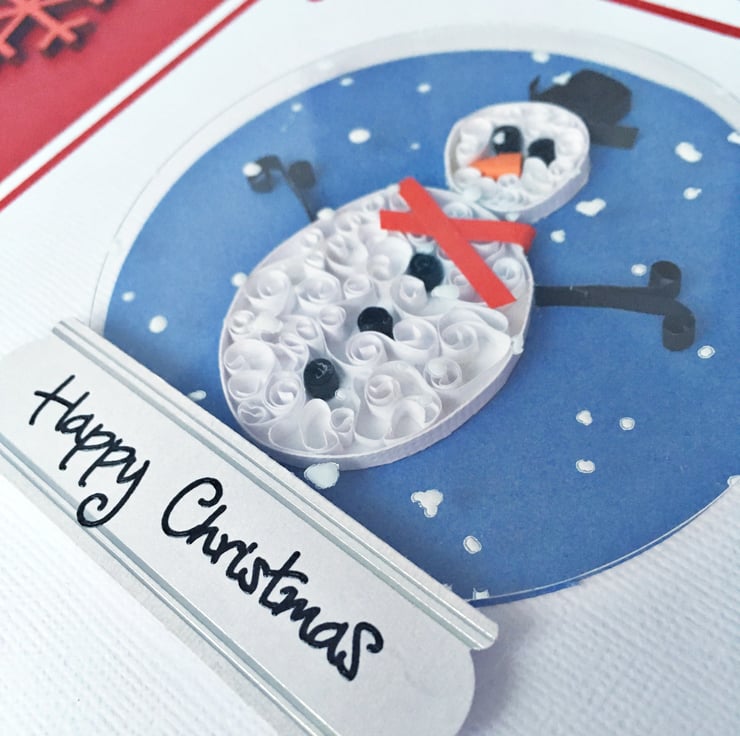 This card features a beautifully quilled snowman behind a snowy acetate circle to create the look of a snow globe.
