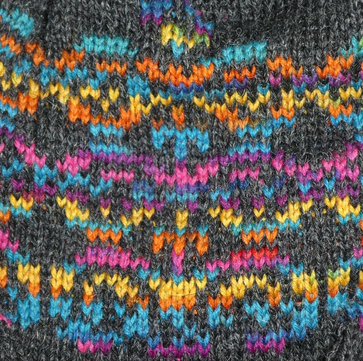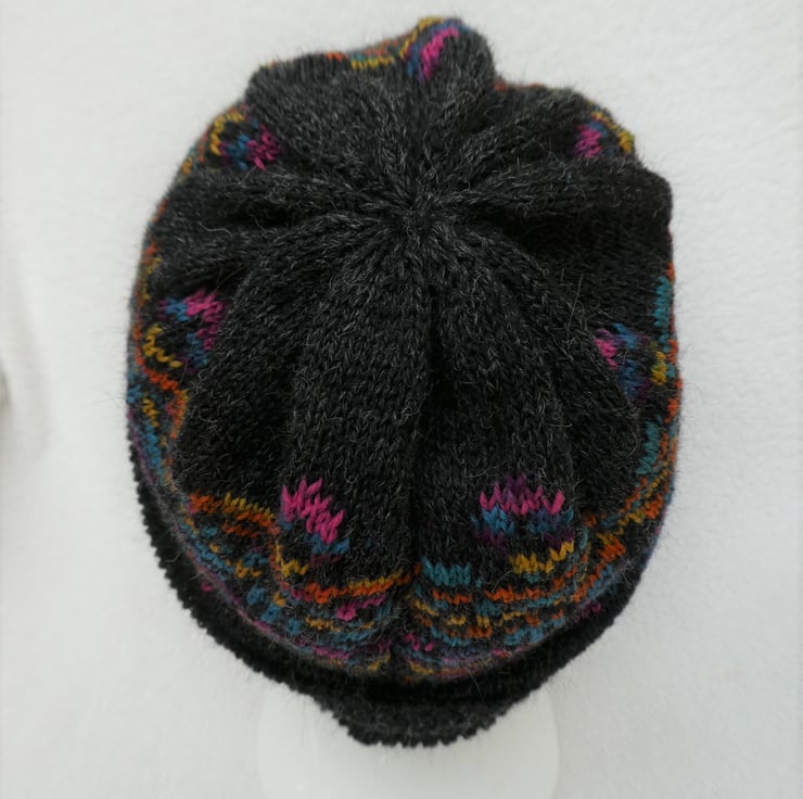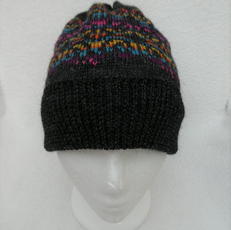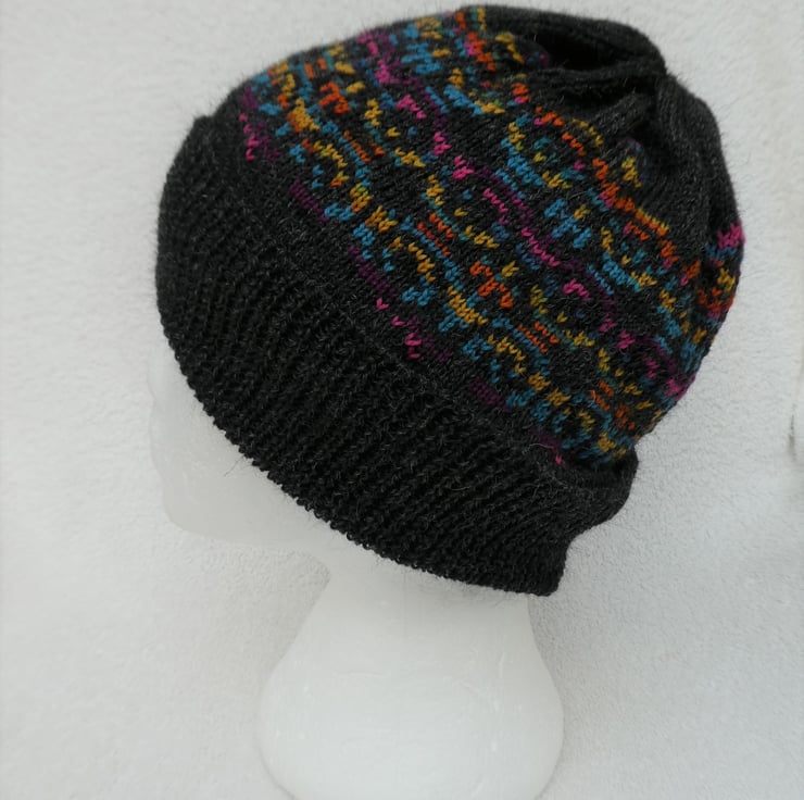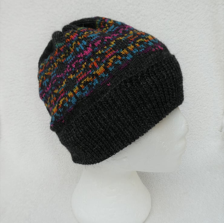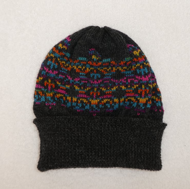 I have created this lovely warm hat on a knitting machine. There is a deep fold up 1x1 rib, and a fair isle multicoloured design. The background dark grey yarn is pure wool, and the patterned yarn is a wool and nylon sock yarn. This hat has been knitted flat, and finished by hand sewing the back seam and gathered at the top.
