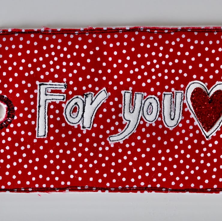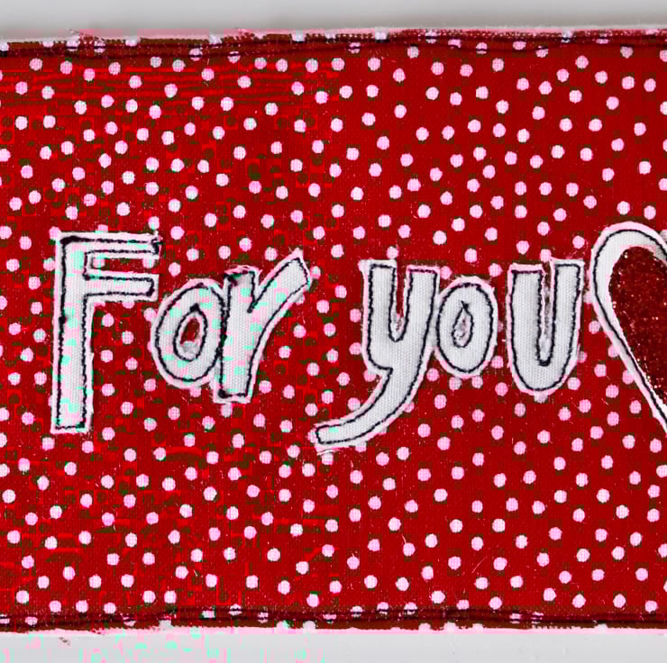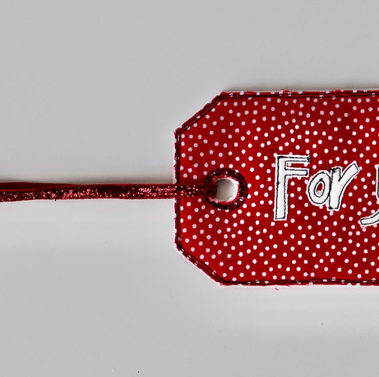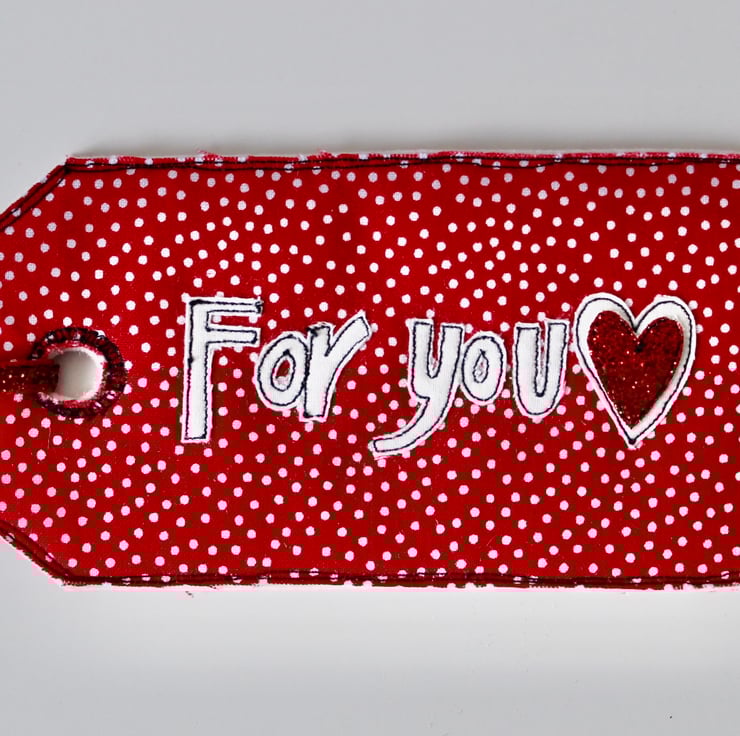 'For you' gift tag is sewn using cotton cloth, glitter cloth. 100% wool felt and free hand machine embroidery; multiple layers of cloth are sewn together and cut out by hand using very sharp scissors. With a glitter ribbon to attach.