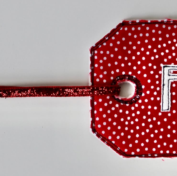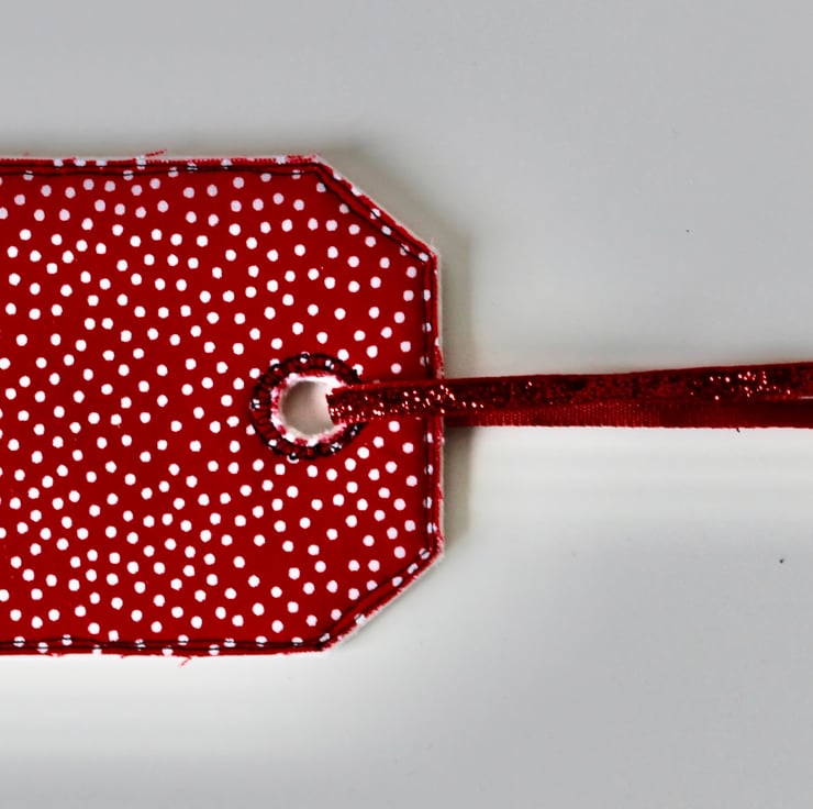 The fabric gift tag measures approximately 14cm by 7cm and the glitter ribbon approximately 16cm.