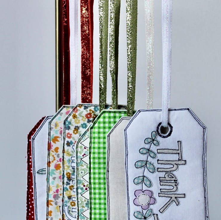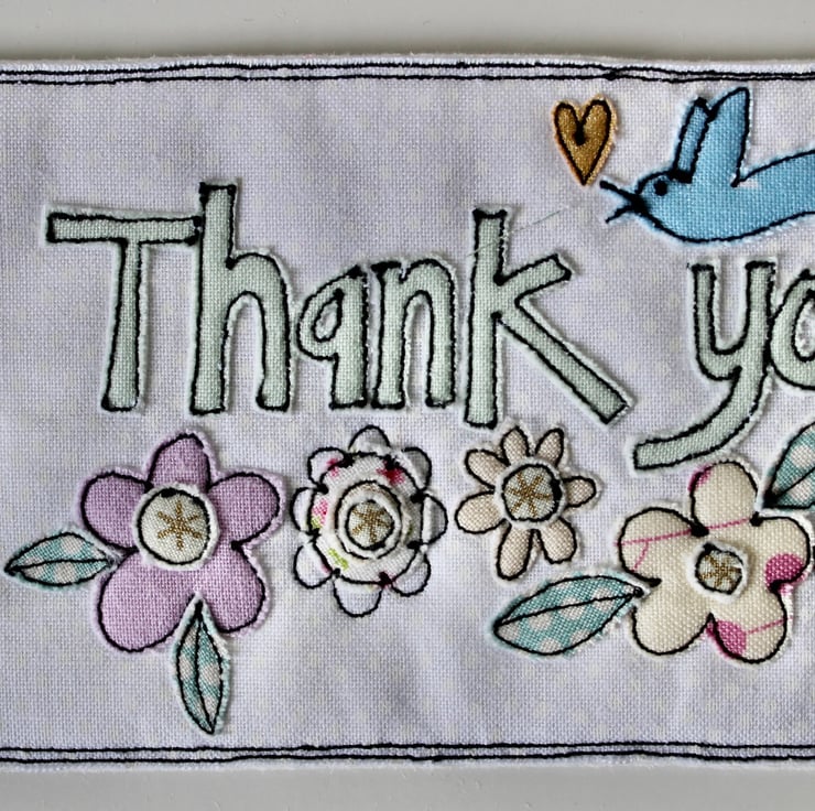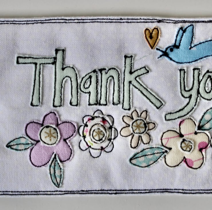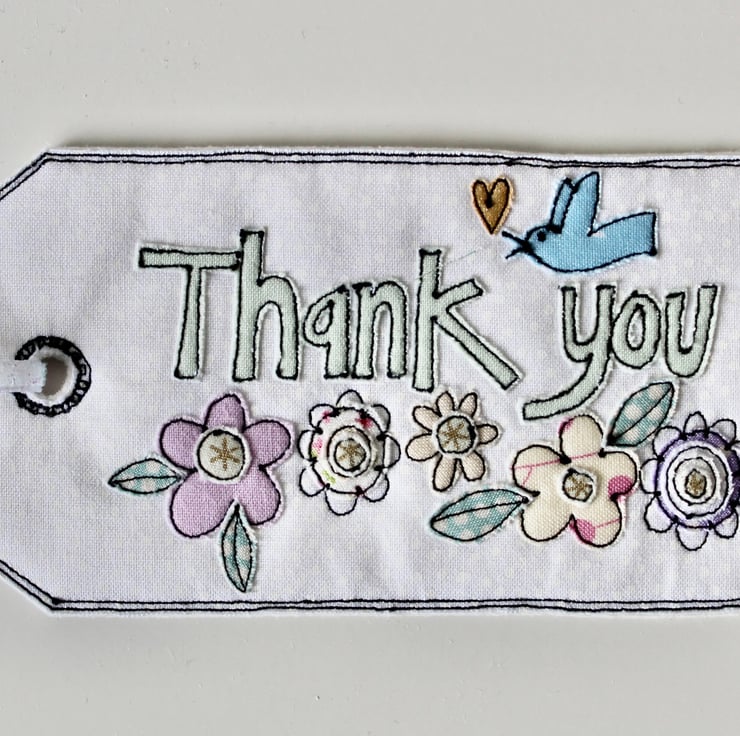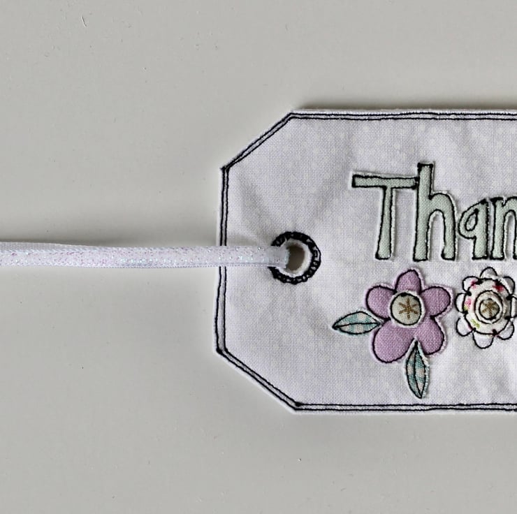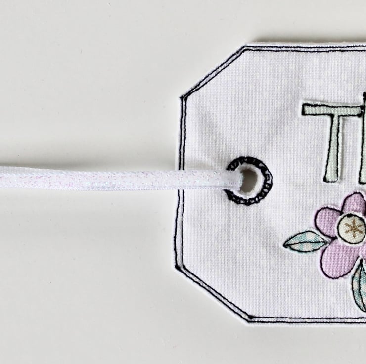 'Thank you' gift tag is sewn using cotton cloth, glitter cloth. 100% wool felt and free hand machine embroidery; multiple layers of cloth are sewn together and cut out by hand using very sharp scissors. With a glitter ribbon to attach.