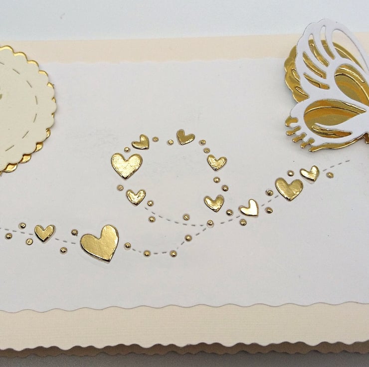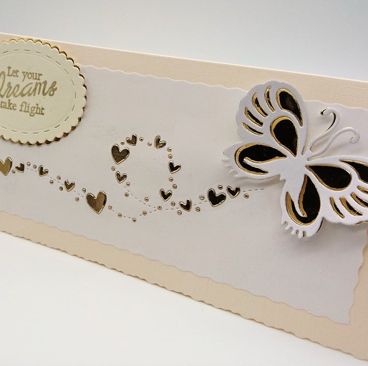 "Let Your Dreams Take Flight" Great Encouragement and Supportive Handmade Greeting Card for Any Occasion from Congratulations to Retirement. Beautiful cream DL horizontal card layered with white panel, plus gold and white decoupaged butterfly with gold hearts paper pieced into whizz trail, finished with gold and white matching sentiment. Handmade with love in my wee studio in Argyll Scotland. FREE POSTAGE TO UK.