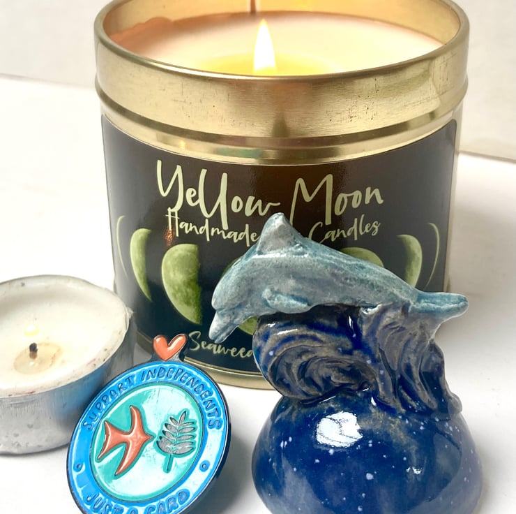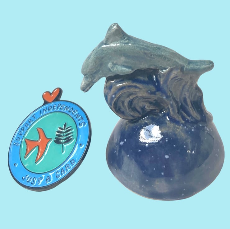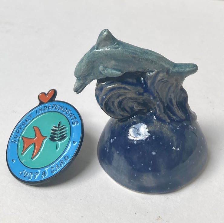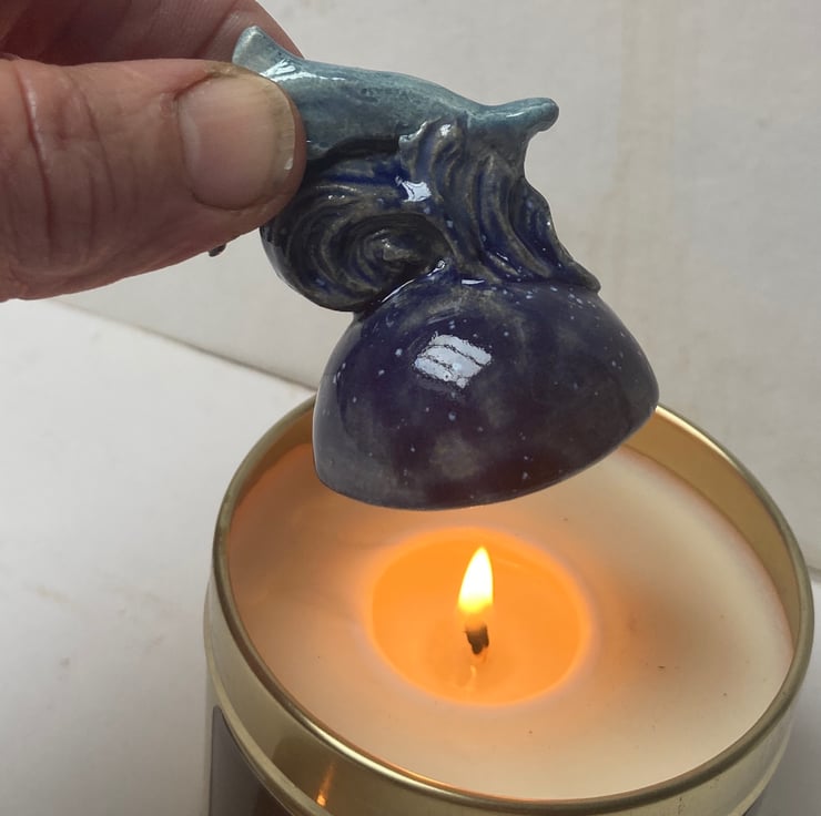 This cute little dolphin riding a wave is a handmade ceramic candle snuffer, created using my own original moulds then hand finished and glazed to make each one unique.