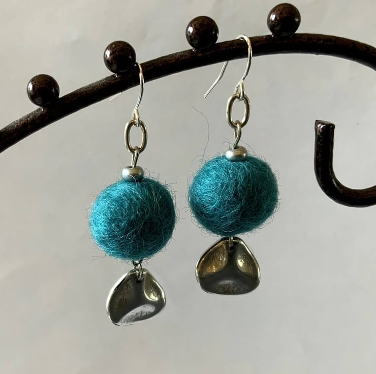 Merino wool felt ball earrings with silver metal charms.