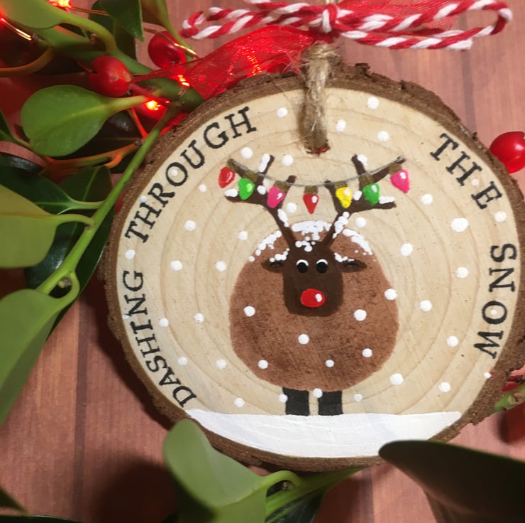 Hand painted onto a medium size wood slice , this decoration features a sweet reindeer with fairy lights strung across his antlers. The wording ‘dashing through the snow’ is stamped around the edge in black.