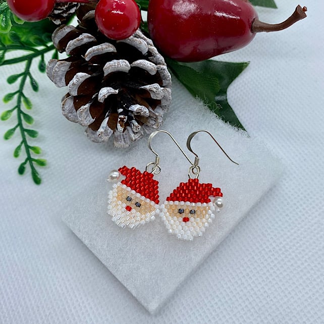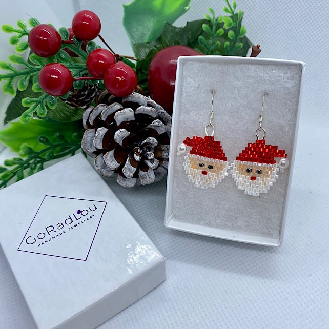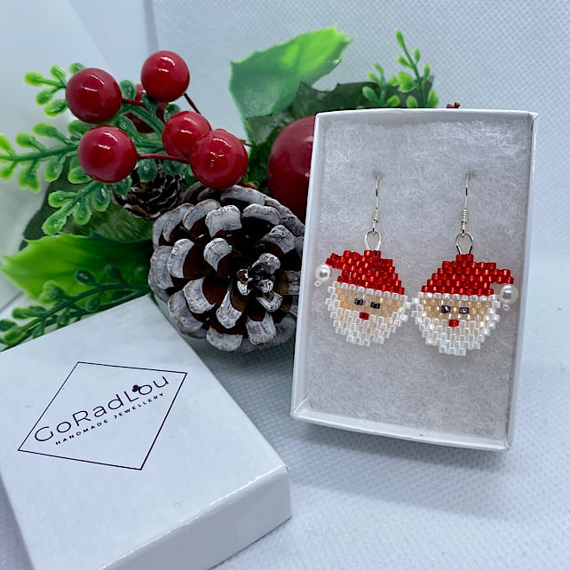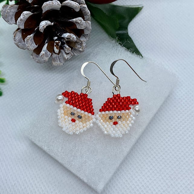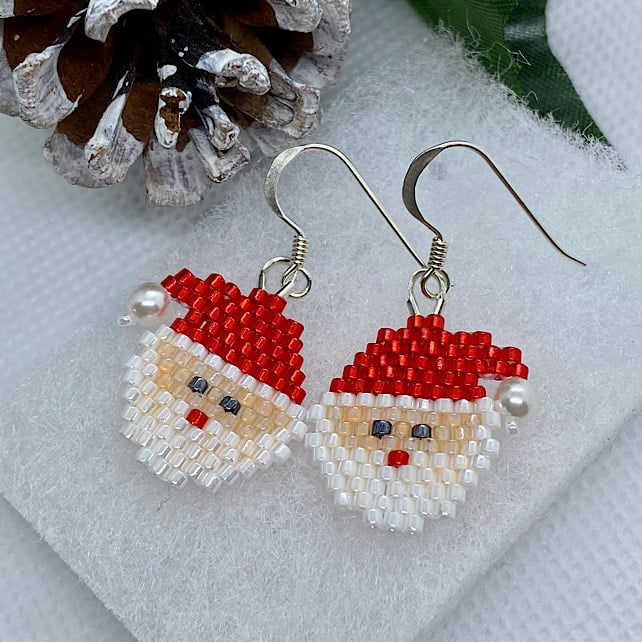 Each one has been made by hand sewing precision cut Miyuki delica beads together to create the shape of Fathers Christmas’s head. The beads used in this design are silver lined, so the earrings will sparkle in the light as you move. Once the head shape is completed, it has then been sealed with a protective varnish to give increased strength and added durability to your earrings.
