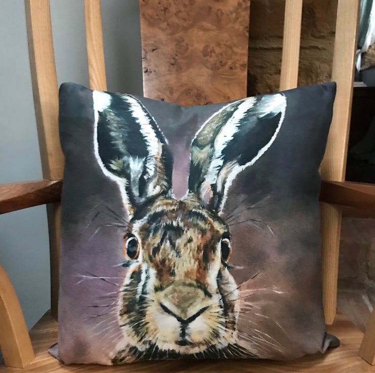 This luxurious square cushion features Hartley the Hare from an original painting by Northern Ireland born and Oxfordshire based artist Janet Bird. The product was manufactured entirely in the UK.