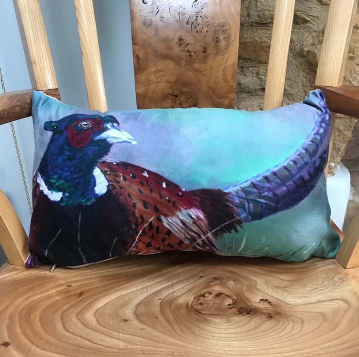 This lovely rectangular (25cms X 45cms) cushion features a pheasant painted by Northern Ireland born and Oxfordshire based artist Janet Bird. The product was manufactured entirely in the UK.