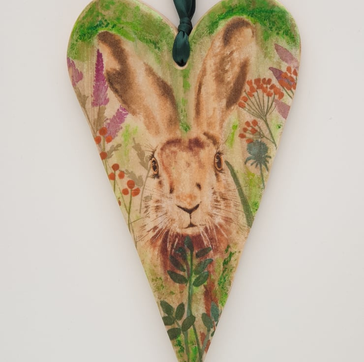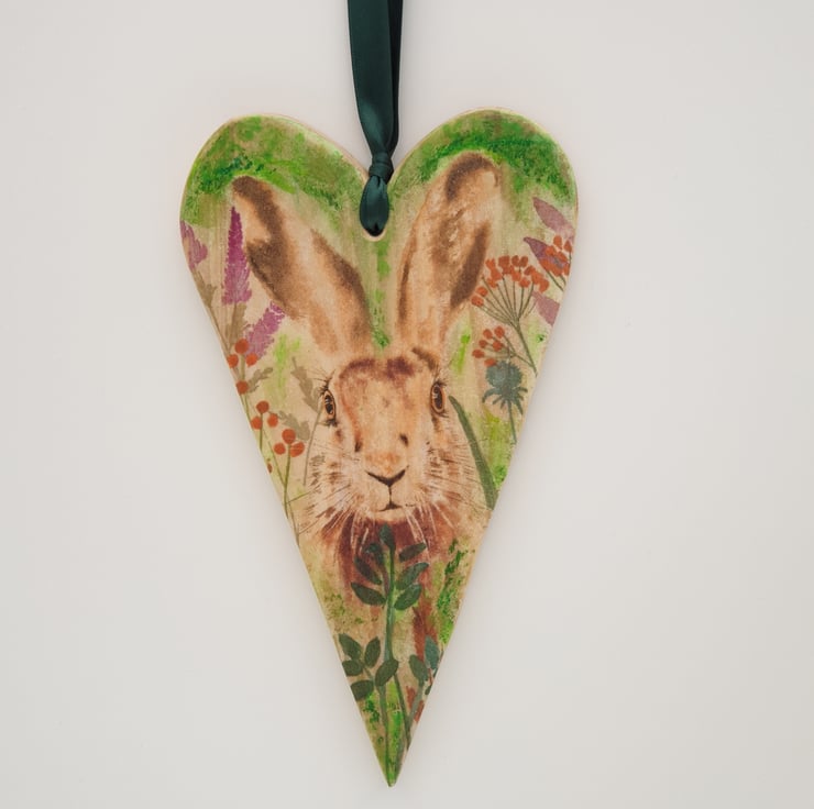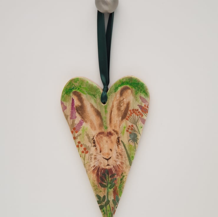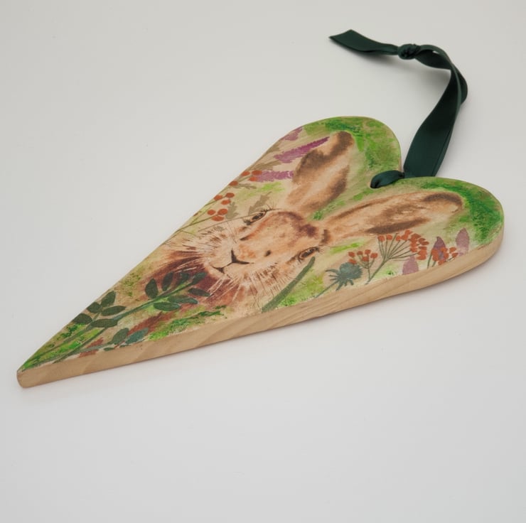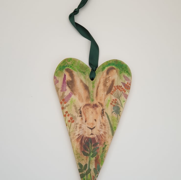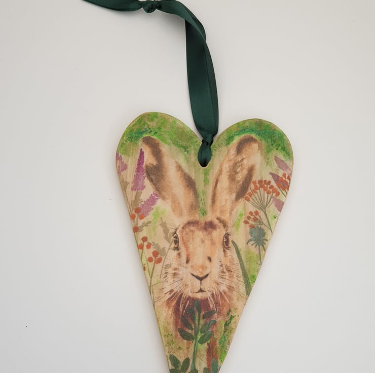 Lovely handmade rustic wooden heart made from reclaimed pine and decoupaged with a hare image and sealed with several coats of varnish. A hole has been drilled in the top of the heart and green satin ribbon has been added to hang it from.